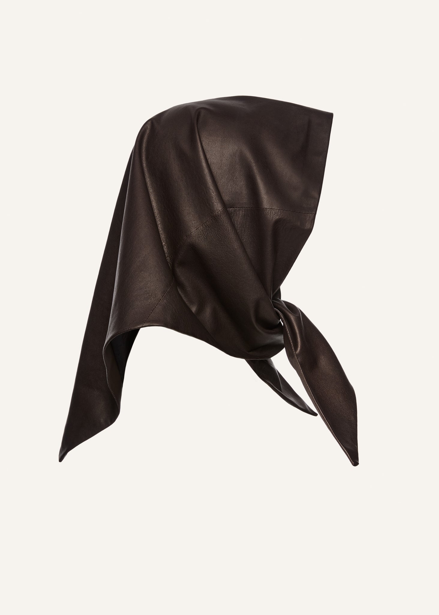A triangle-shaped leather scarf designed to bring a modern edge to any outfit. The smooth, soft leather drapes effortlessly, and the elongated ends allow for a stylish tie under the chin. This scarf makes a statement while paying homage to timeless headwear traditions.