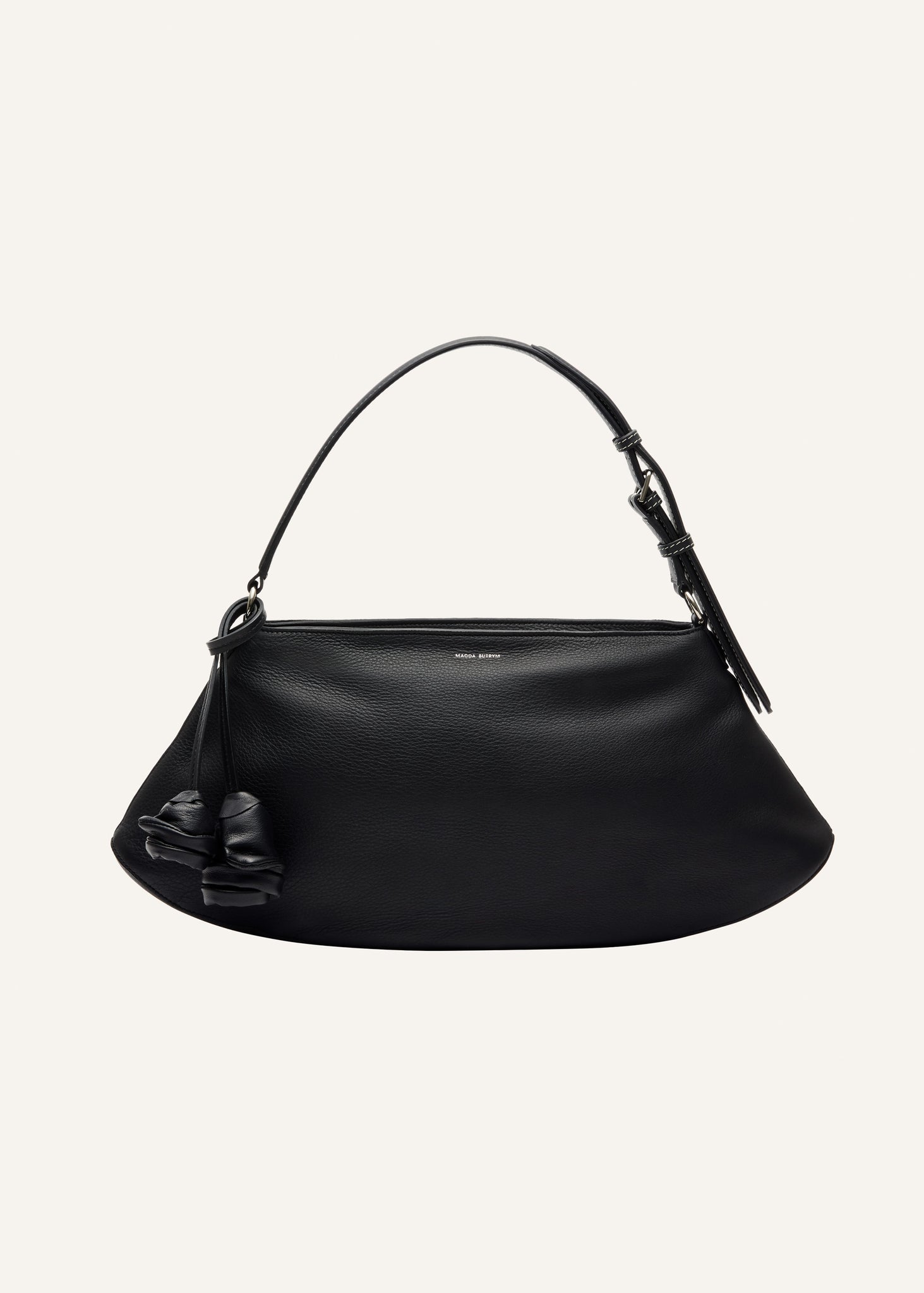An elevated everyday essential, the Maya bag is crafted from supple leather with a softly structured silhouette. Designed for both elegance and function, it features a minimalist top handle and discreet metallic logo detail. The standout element is its signature detachable leather flower charm, adding a feminine and artisanal touch. The roomy interior and timeless design make this bag a versatile accessory for both day and evening looks.