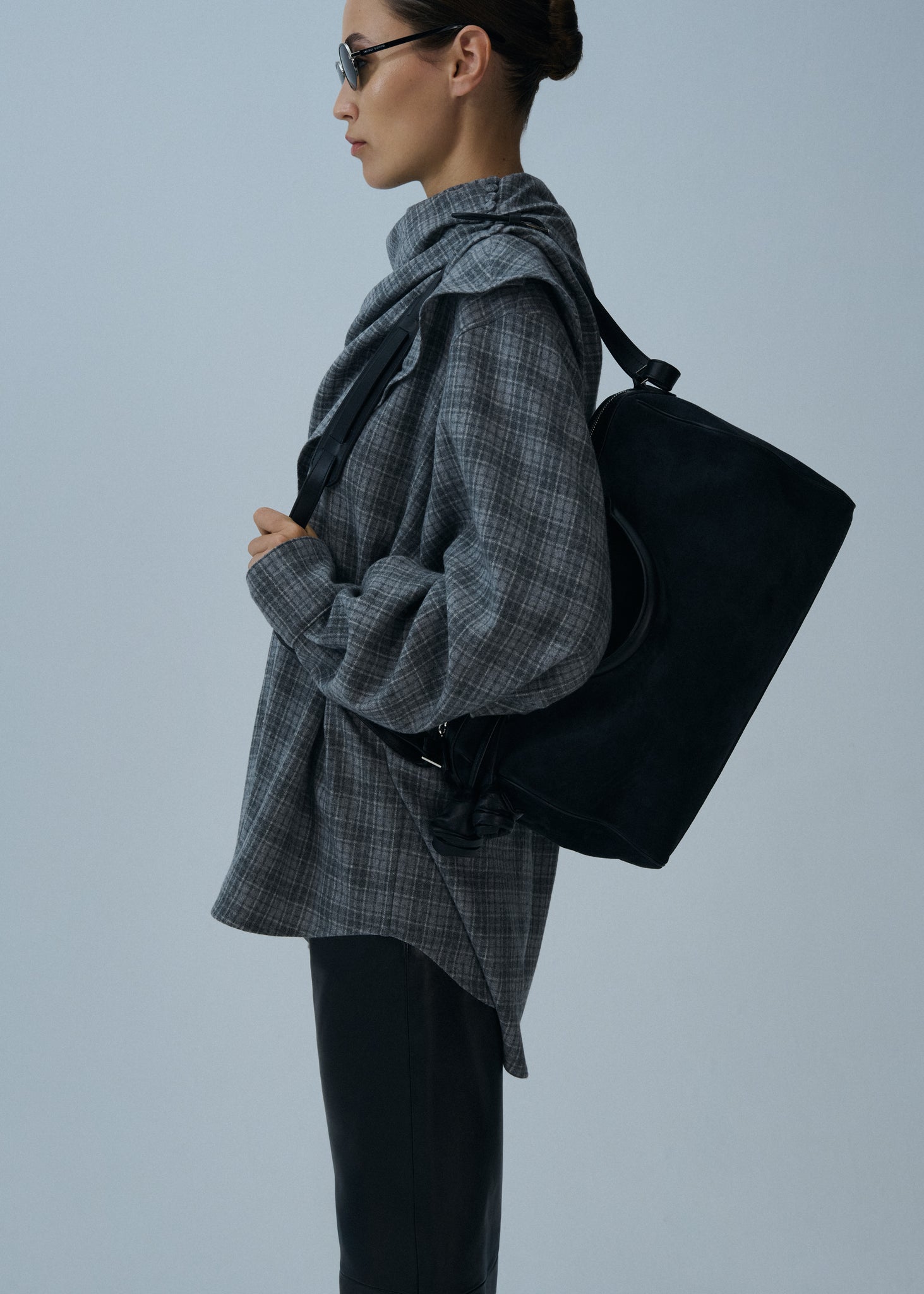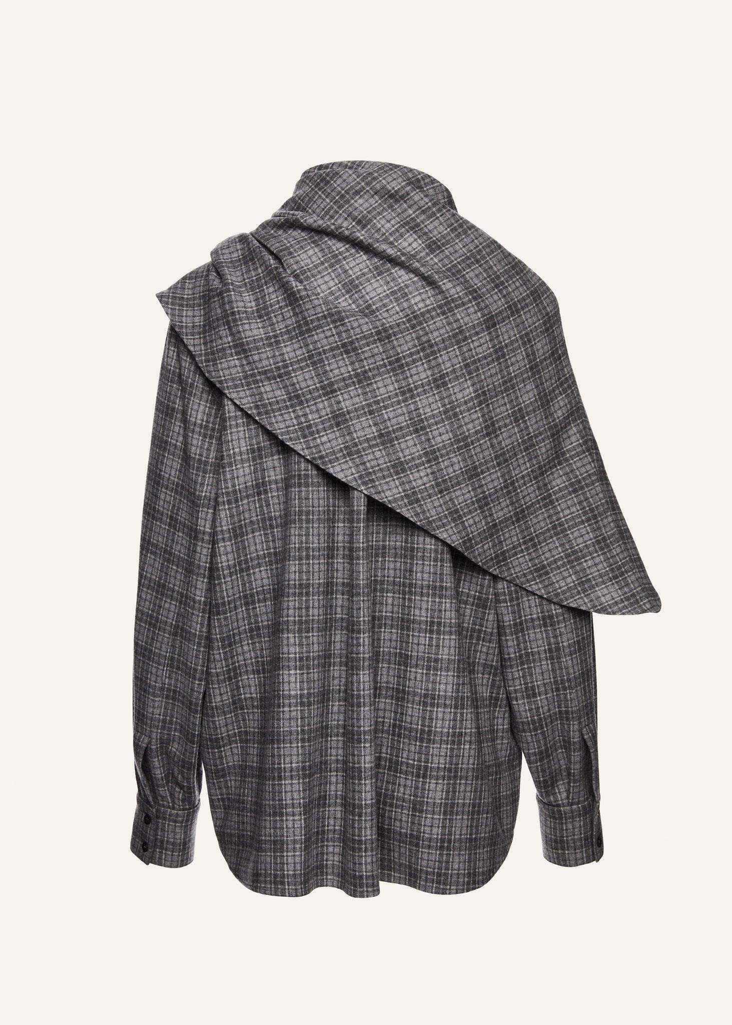 A classic oversized button-down collared shirt that can be worn with or without the cape. The pull-over style layer has a striking asymmetrical cut. Made from a wool and cashmere blend.