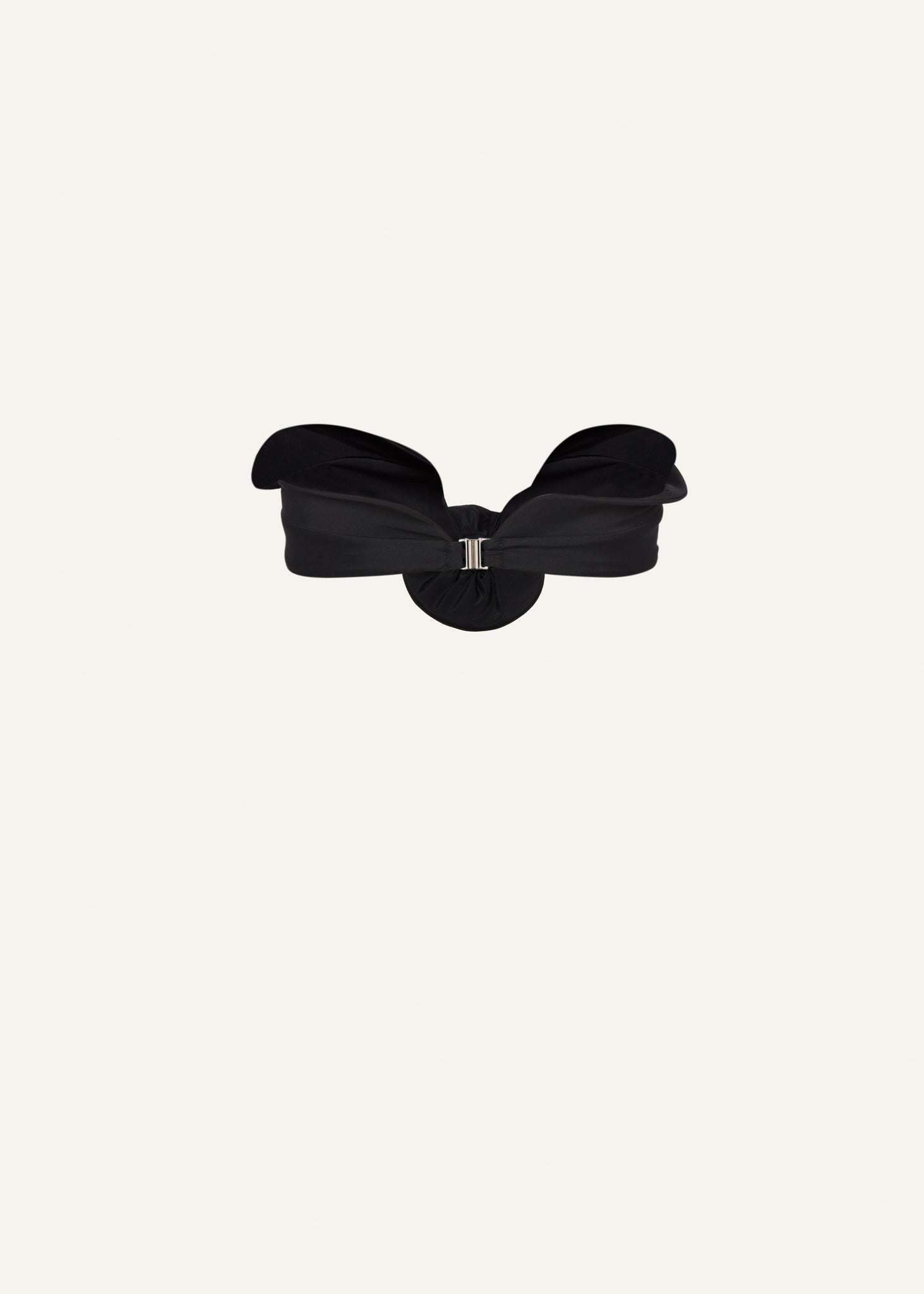 An elegant black bandeau swim top featuring a sculptural design and adorned with a standout rose-shaped centerpiece for a touch of romance. Pairs beautifully with matching or contrasting swim bottoms for a refined, chic look.