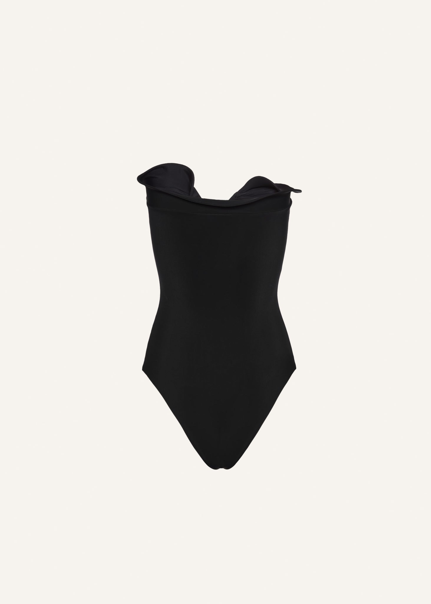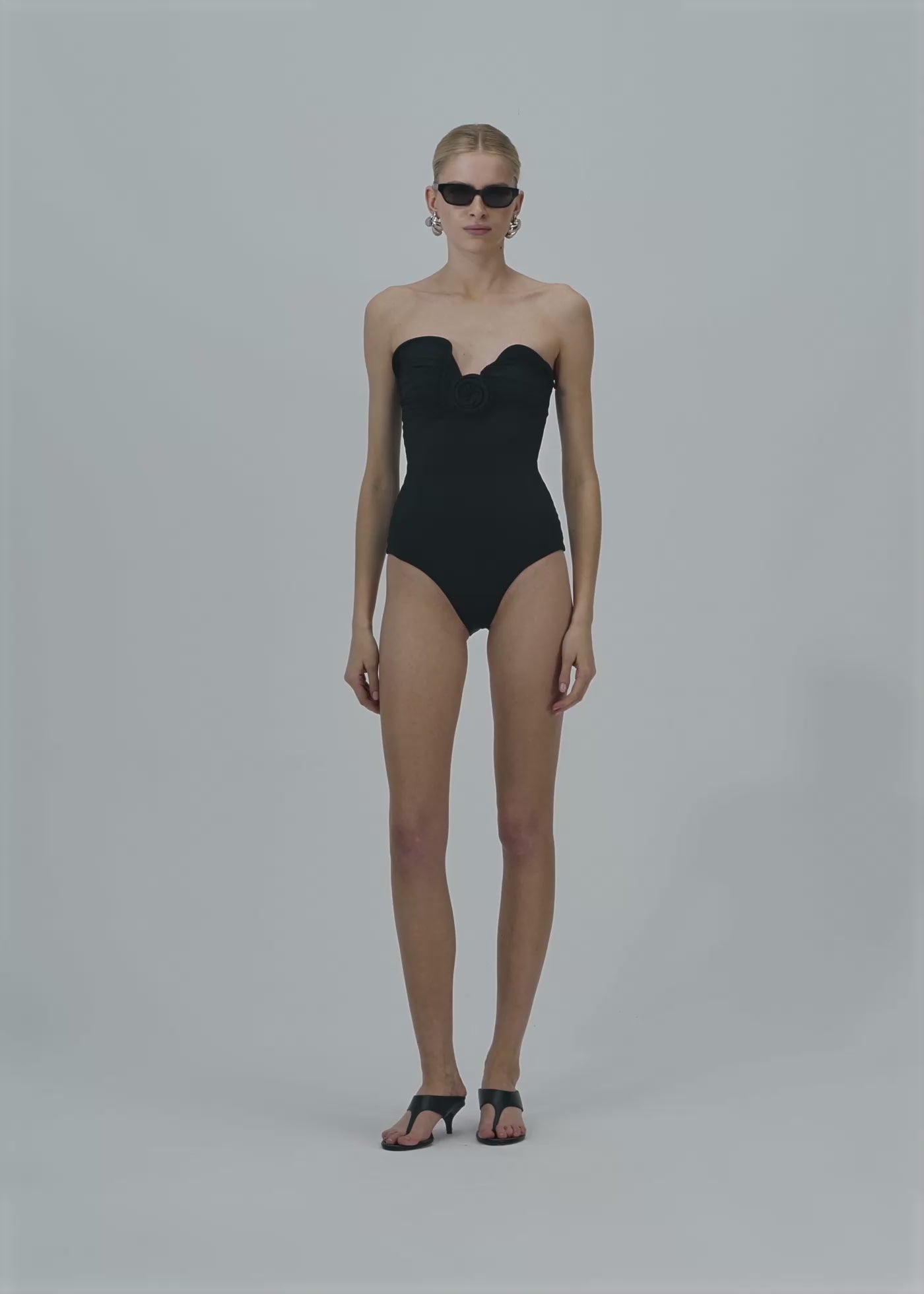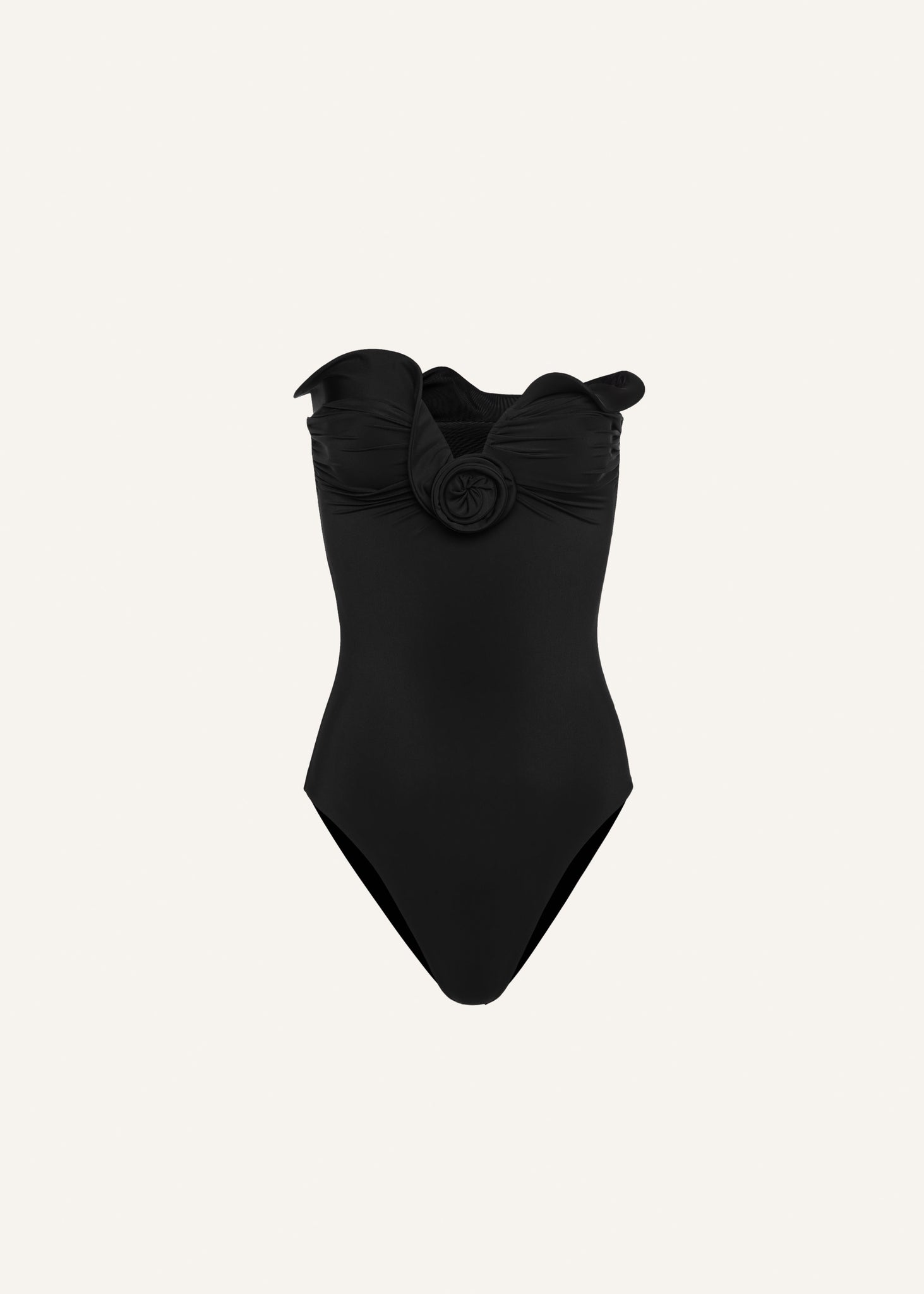 Embrace pool-side elegance with this black rose bustier swimsuit. Featuring a sweetheart neckline with ruffle accents and a signature rosette at the center, this piece combines refined structure and femininity. The contoured silhouette creates a flattering fit, making it a standout addition to any swimwear collection.
