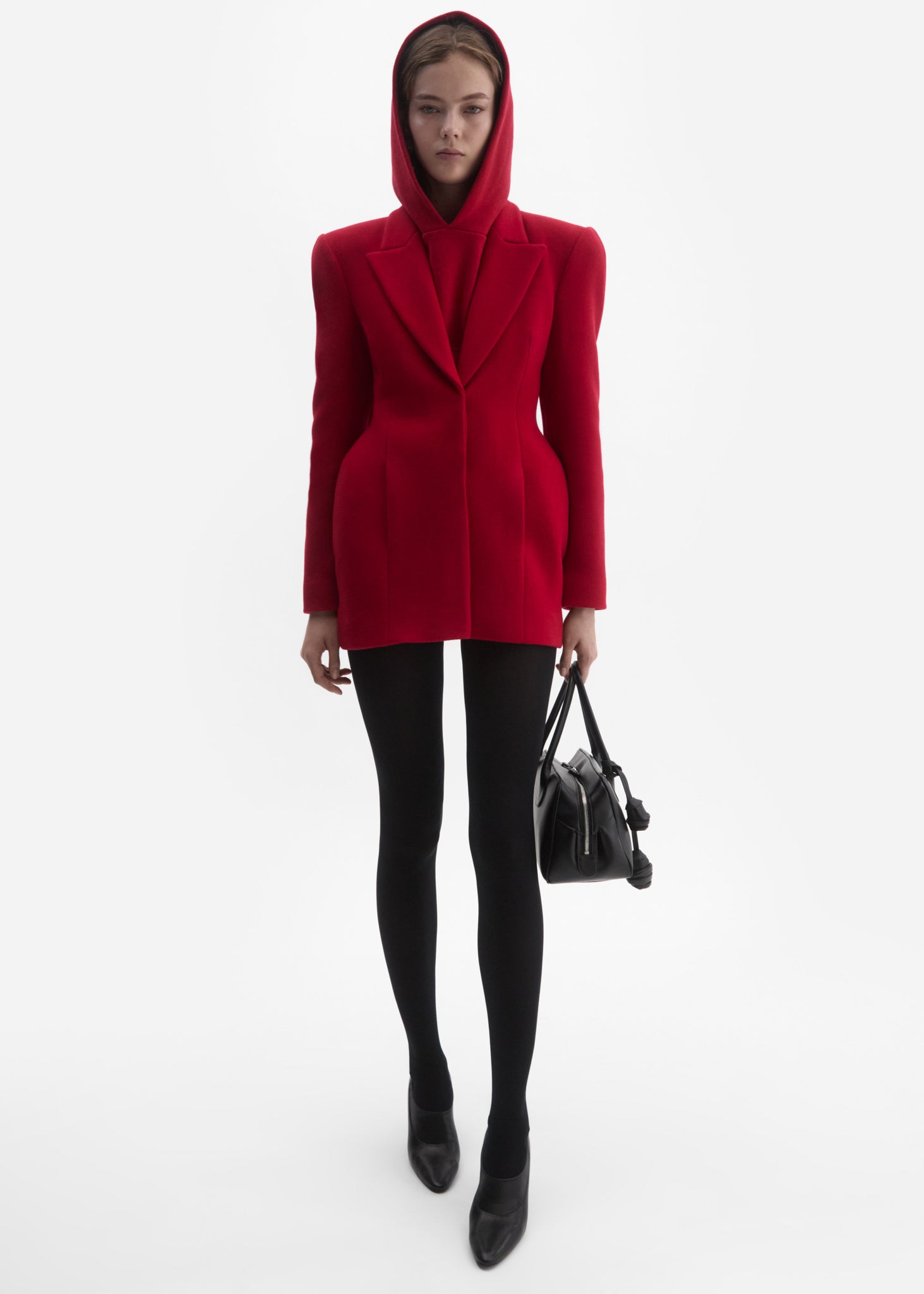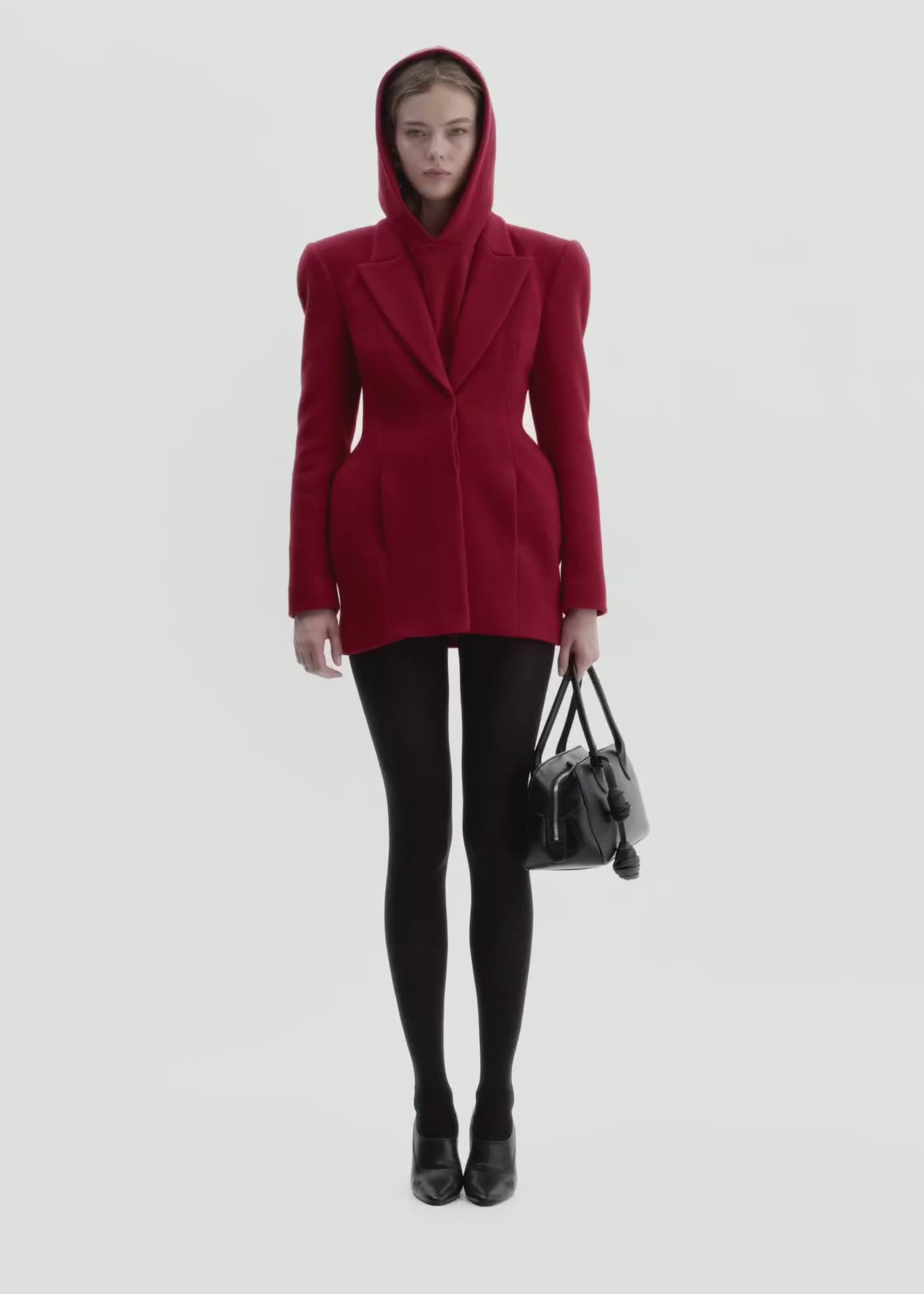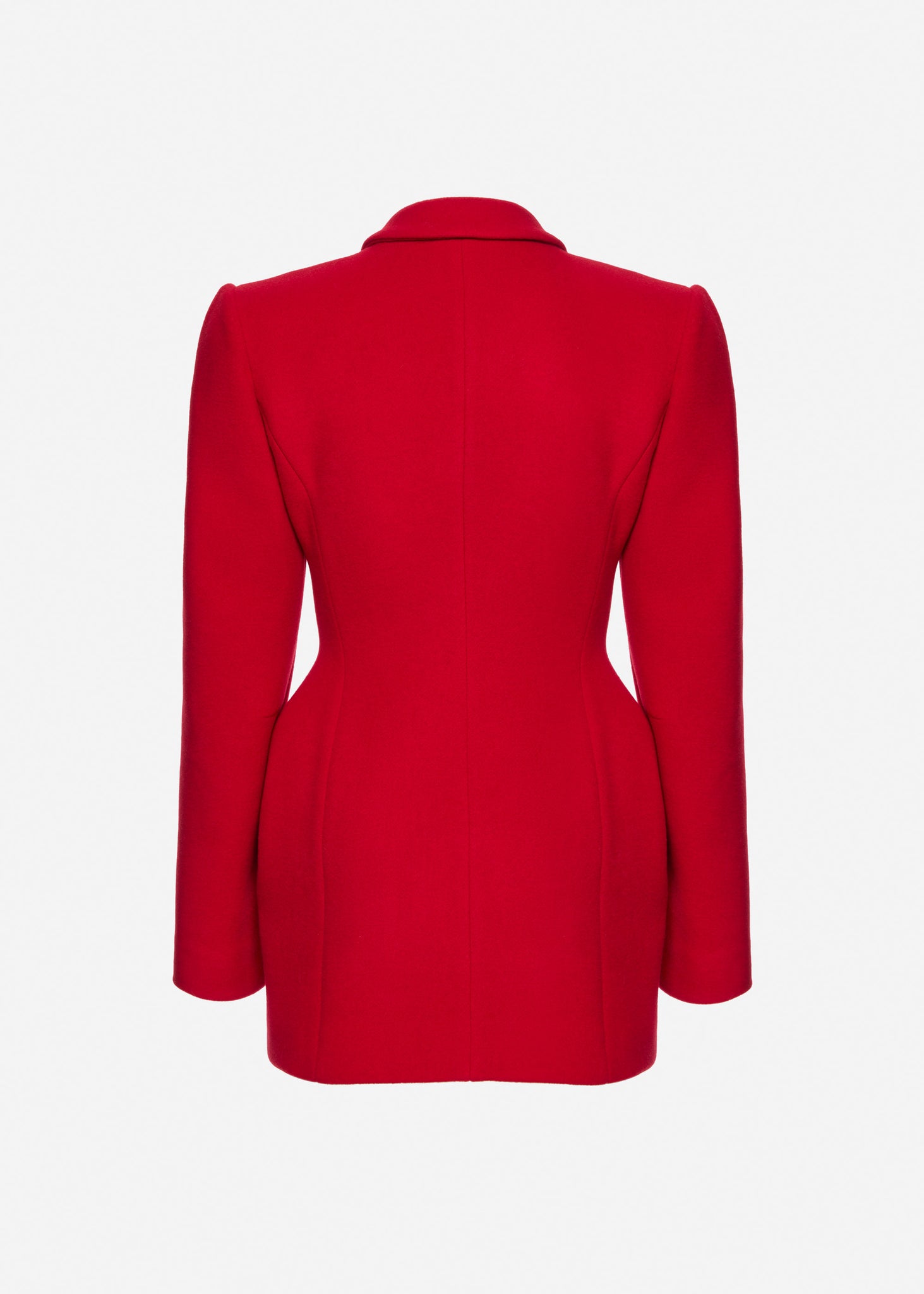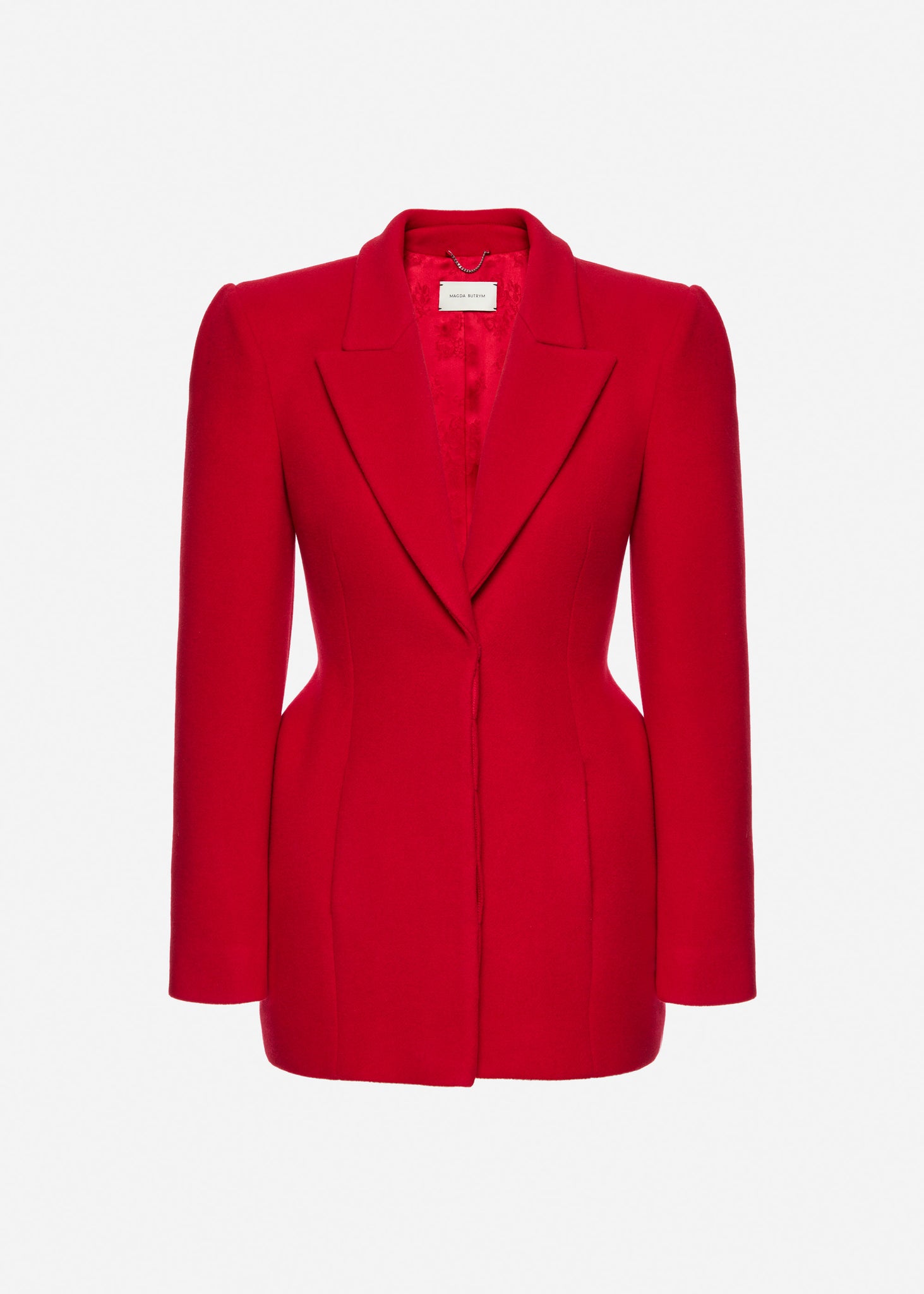 A meticulously tailored wool blazer designed with Magda Butrym's signature sculpted silhouette. The exaggerated hip pads create a distinct hourglass shape, giving structure and femininity to the fit. This piece blends menswear-inspired tailoring with couture-level craftsmanship. Wear it as a blazer or mini dress for a statement look.