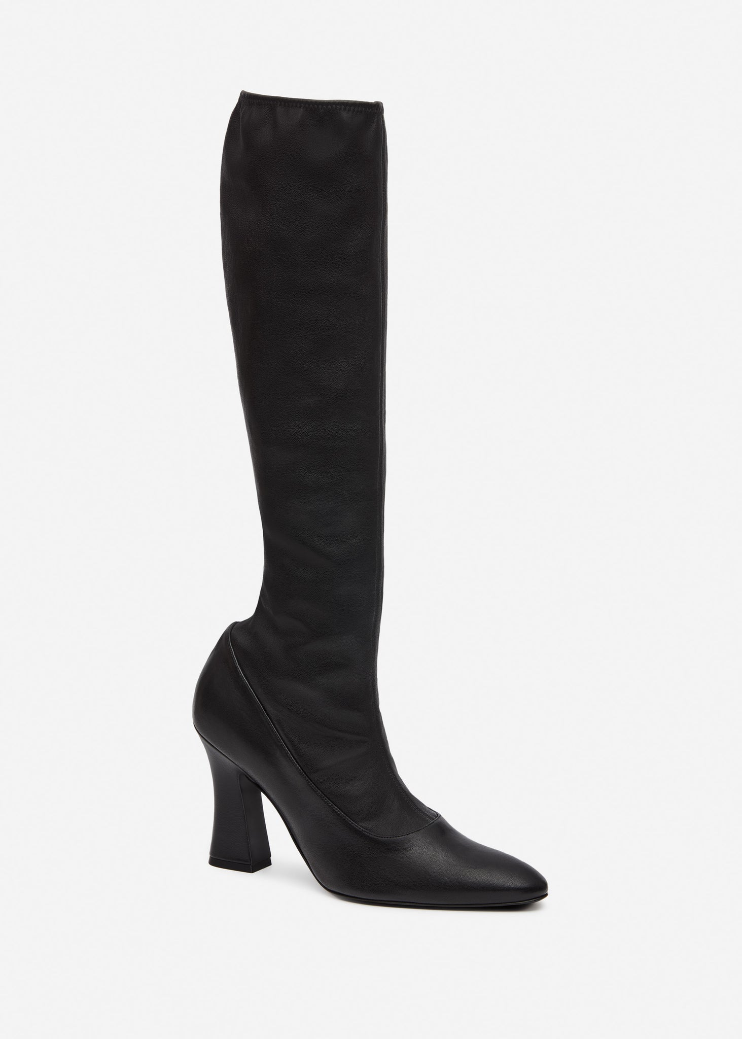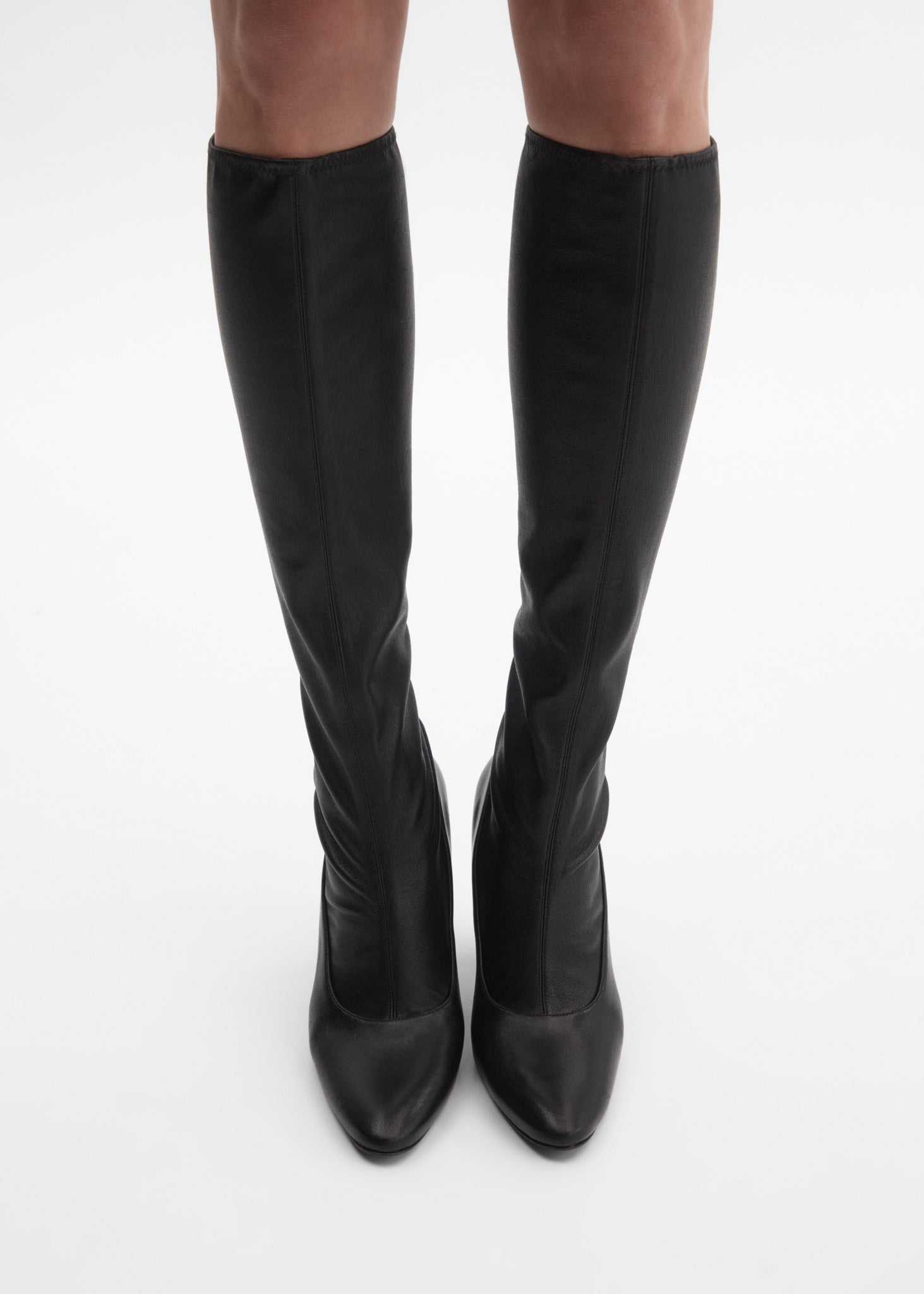 Chic below-the-knee boots made from supple stretch leather. Designed for a sleek, form-fitting silhouette with an elastic band at the top. Finished with a sculpted mid-heel and pointed toe. Heel height is 9,5 cm.