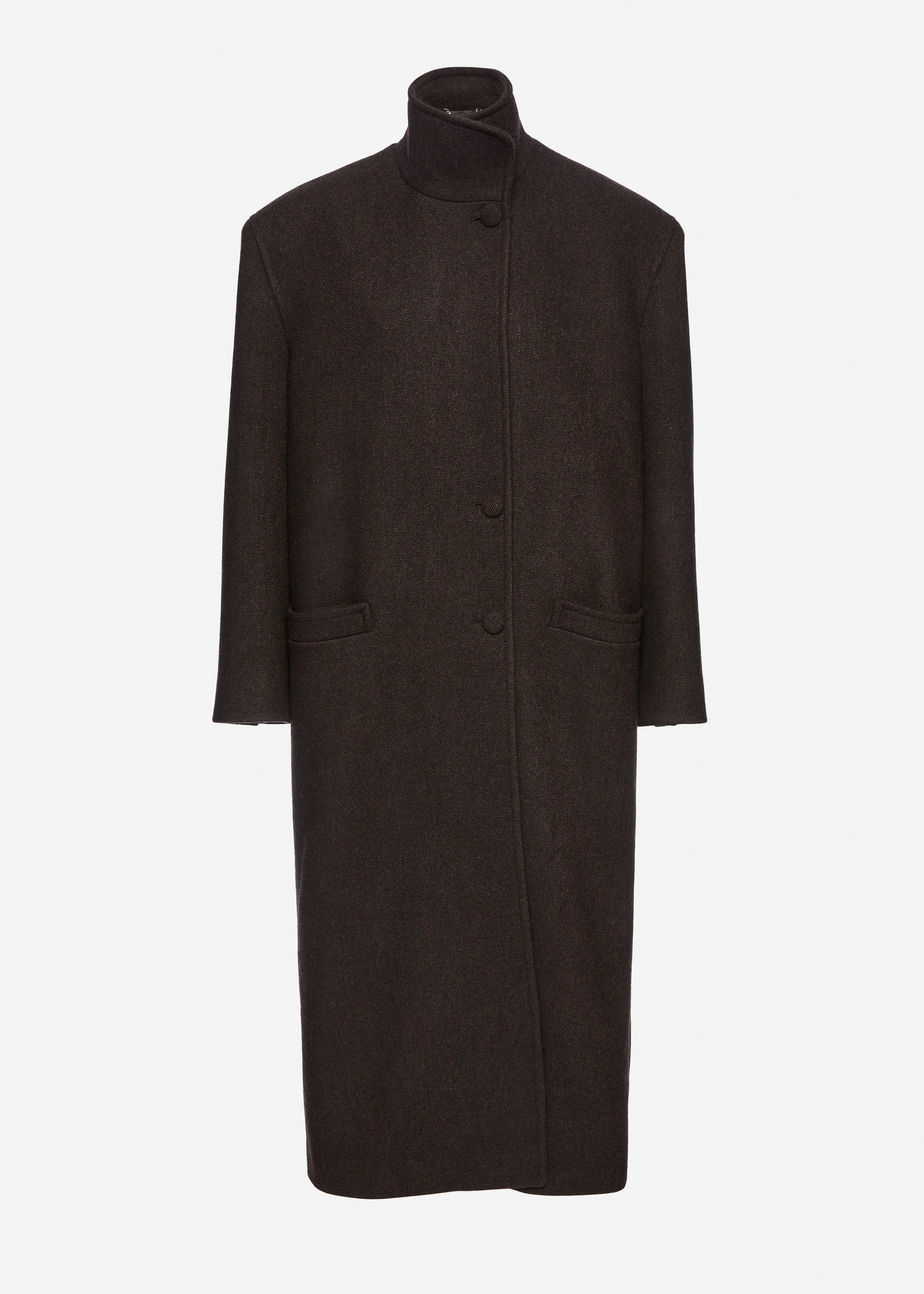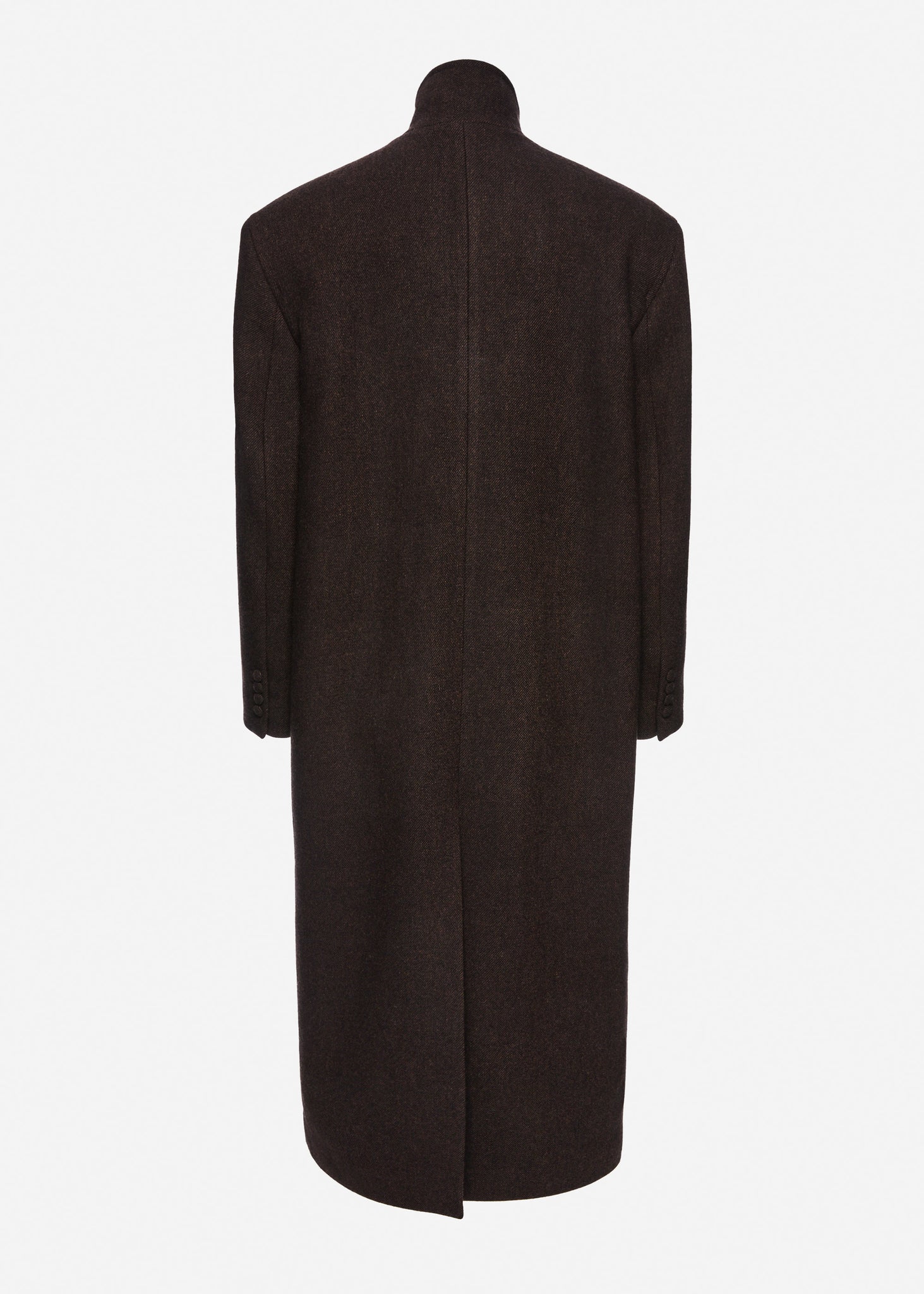 A long, tapered coat crafted from pure cashmere for a luxurious, structured drape. Designed with a high rounded stand collar and a single-breasted front that fastens with three buttons. Features welt pockets at the front and sleeves finished with buttoned vents. The back includes a long vent for movement and decorative top stitching at the underarm seam. Fully lined with interior buttoned welt pockets.