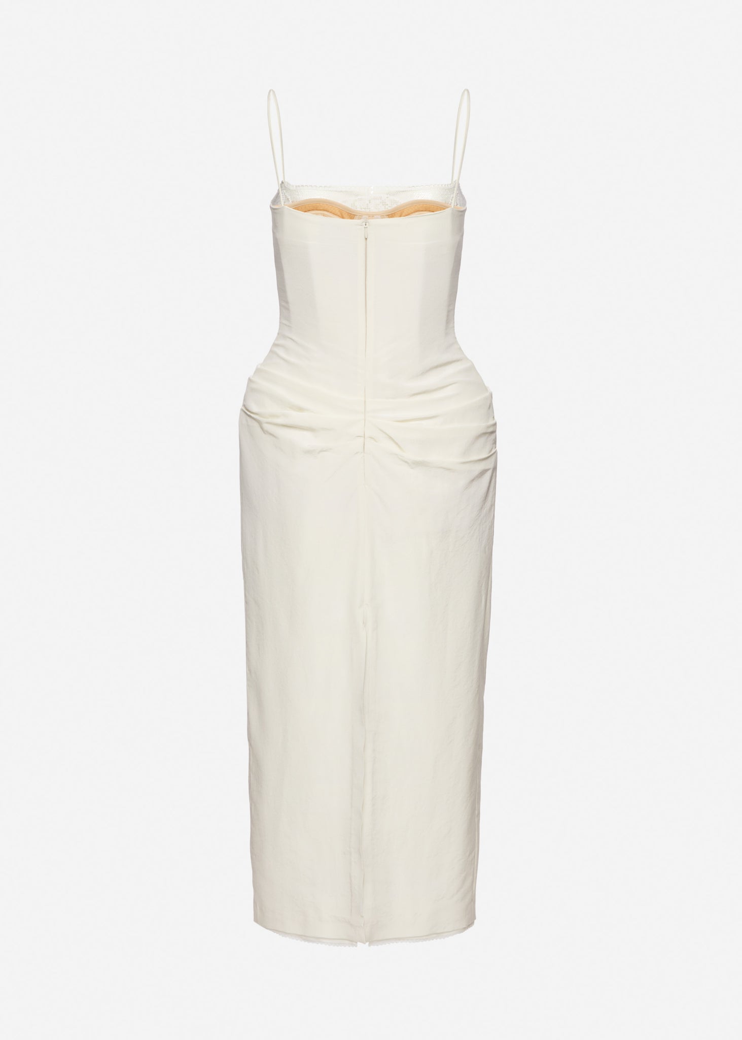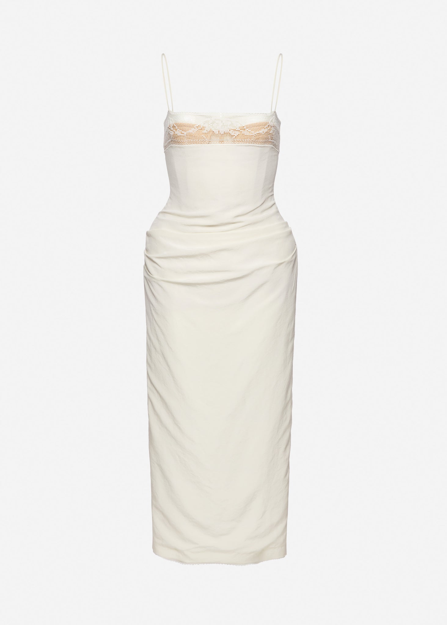 A mid-length fitted dress crafted from lightly crinkled silk. Features thin shoulder straps and a straight neckline trimmed with delicate lace. A built-in corset provides structure and is subtly visible through the lace panel at the front. The silhouette is softly draped with side and back gathers, accentuating the shape. The hips are enhanced with internal padding. Fastens at the back with a concealed zipper and a slit for ease of movement. The inner hem is detailed with a silk placket edged in fine lace.