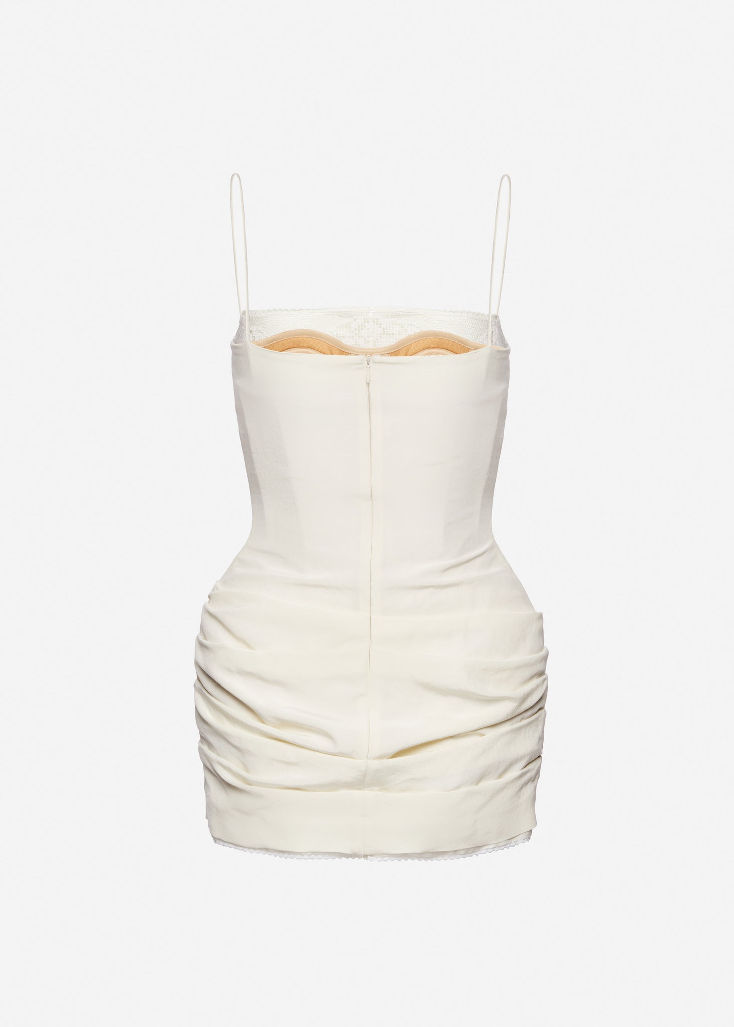 A mini-length fitted dress crafted from lightly crinkled silk. Features thin shoulder straps and a straight neckline trimmed with delicate lace. A built-in corset provides structure and is subtly visible through the lace panel at the front. The silhouette is softly draped with side and back gathers, accentuating the shape. The hips are enhanced with internal padding. Fastens at the back with a concealed zipper and a slit for ease of movement. The inner hem is detailed with a silk placket edged in fine lace.