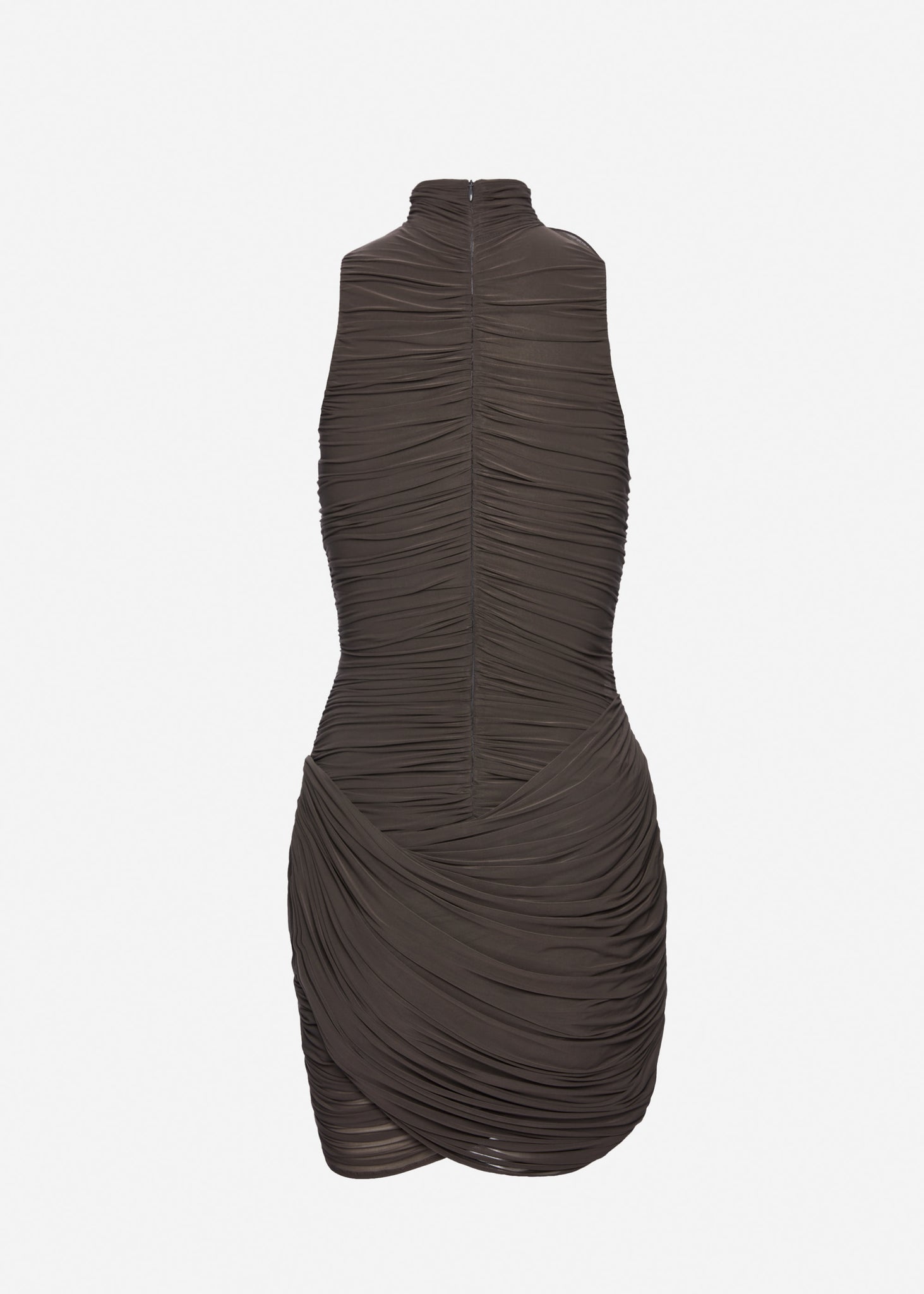 A figure-hugging mini dress with a ruched high neckline and sculptural detailing throughout. A handcrafted floral appliqué adorns the neckline, while additional draped overlays at the hips add volume and movement. Subtle padding accentuates the hips for a sculpted effect. Finished with a concealed back zip and an integrated bodysuit for a seamless fit.