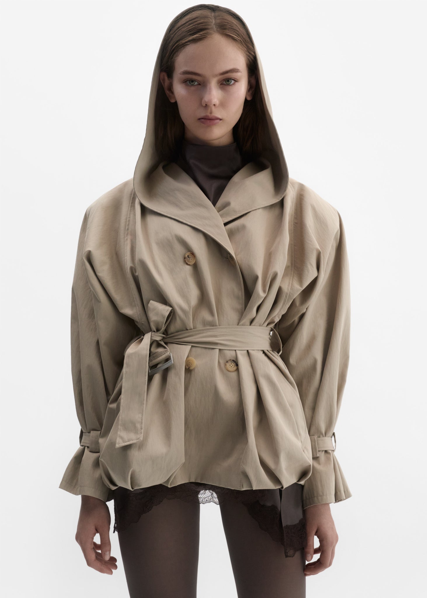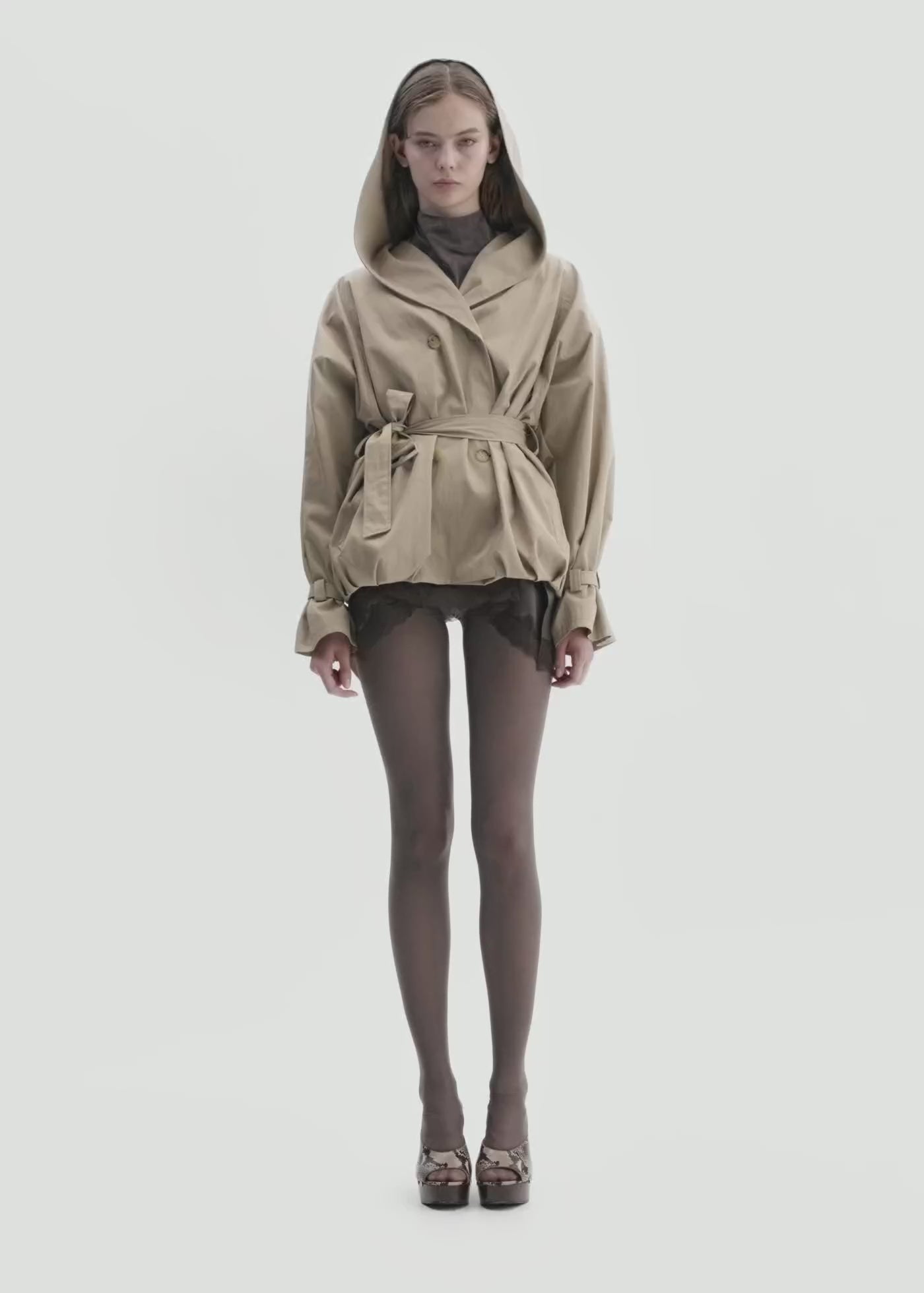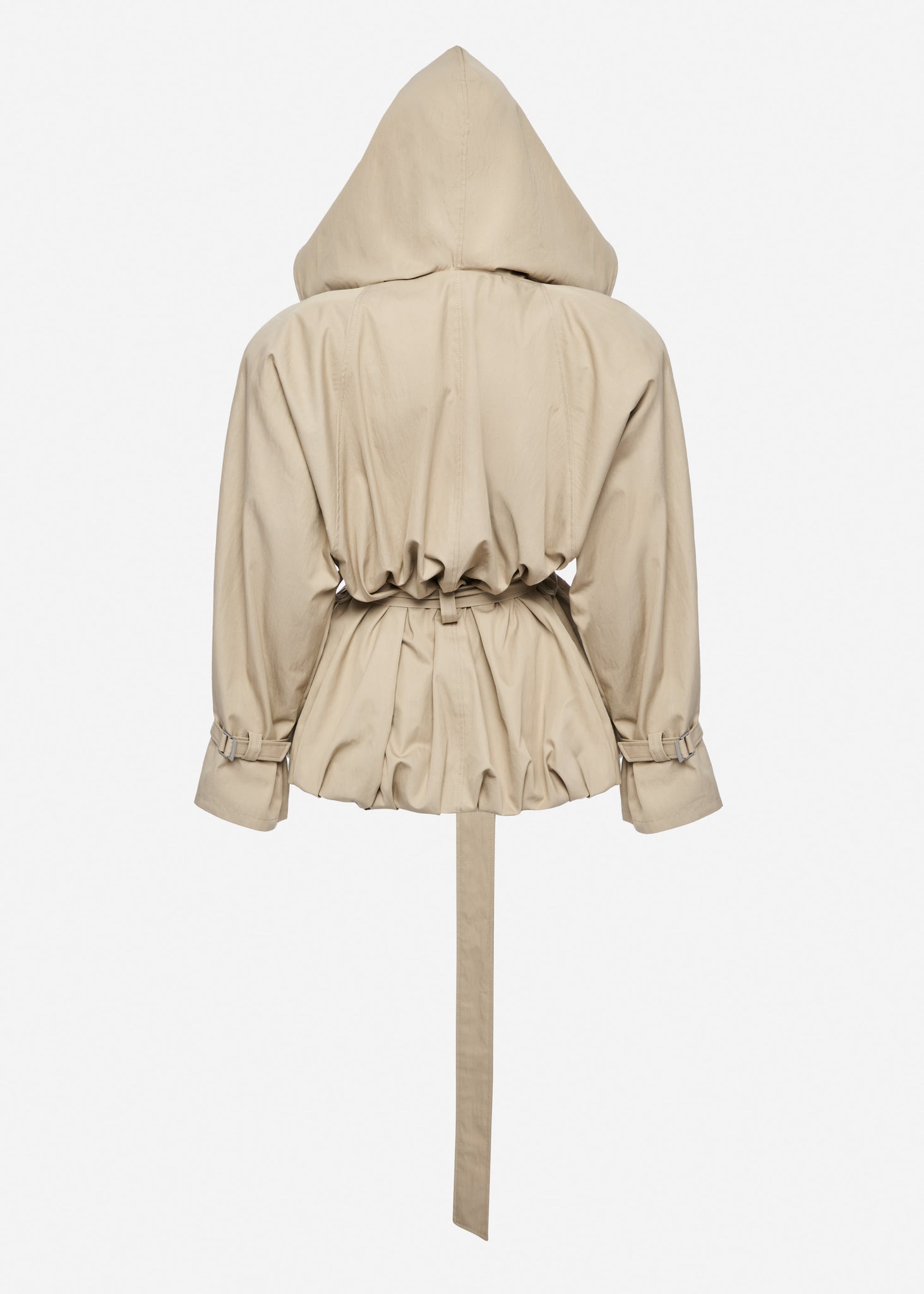 A cropped jacket crafted from cotton blend with a softly structured finish. Designed with a voluminous hood and raglan sleeves, it features a double-breasted front with four buttons and a matching belt at the waist. Zippered welt pockets and adjustable sleeve straps add functional detail. The hem is gathered into pleats to create a rounded bubble shape. Fully lined for comfort.