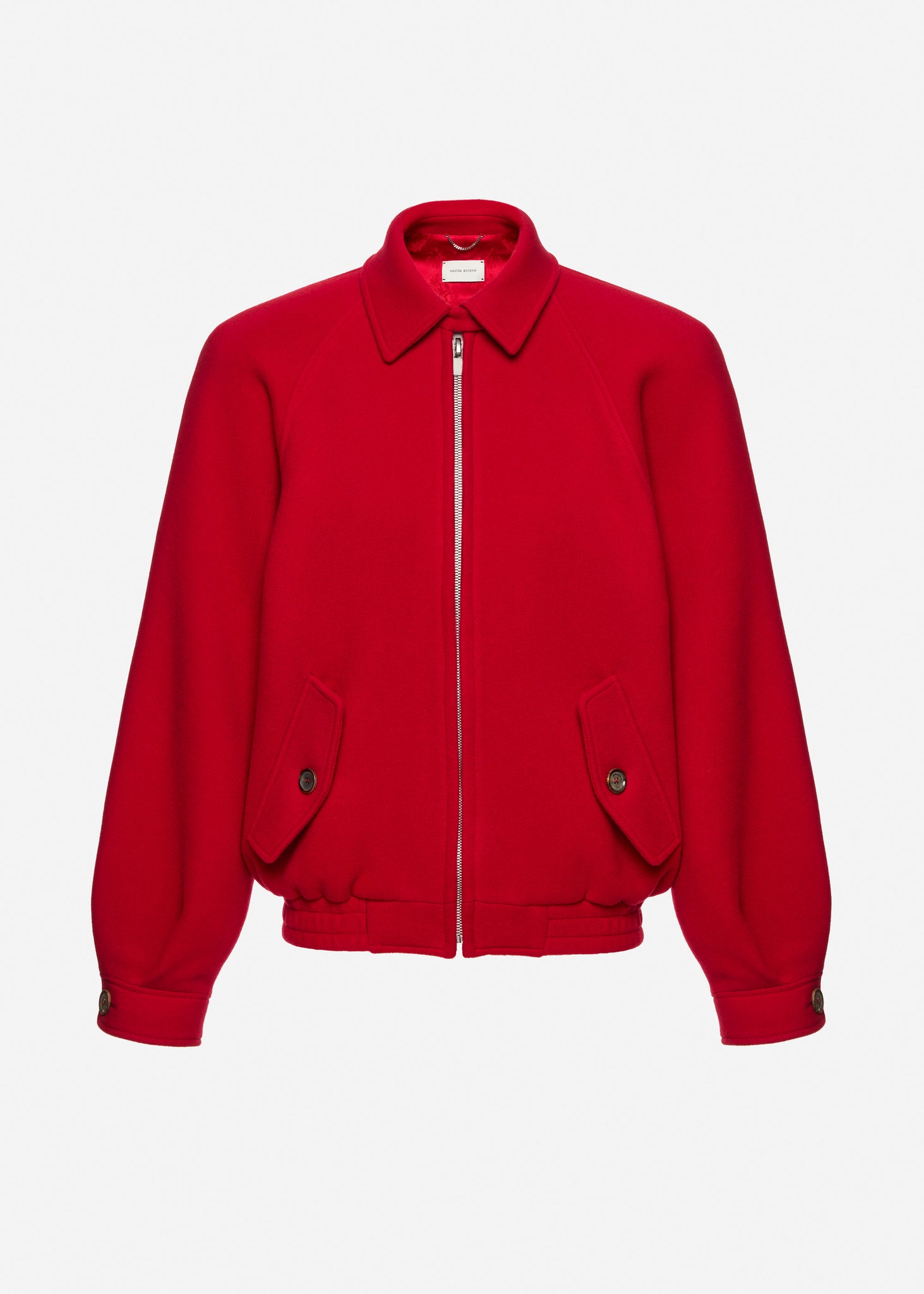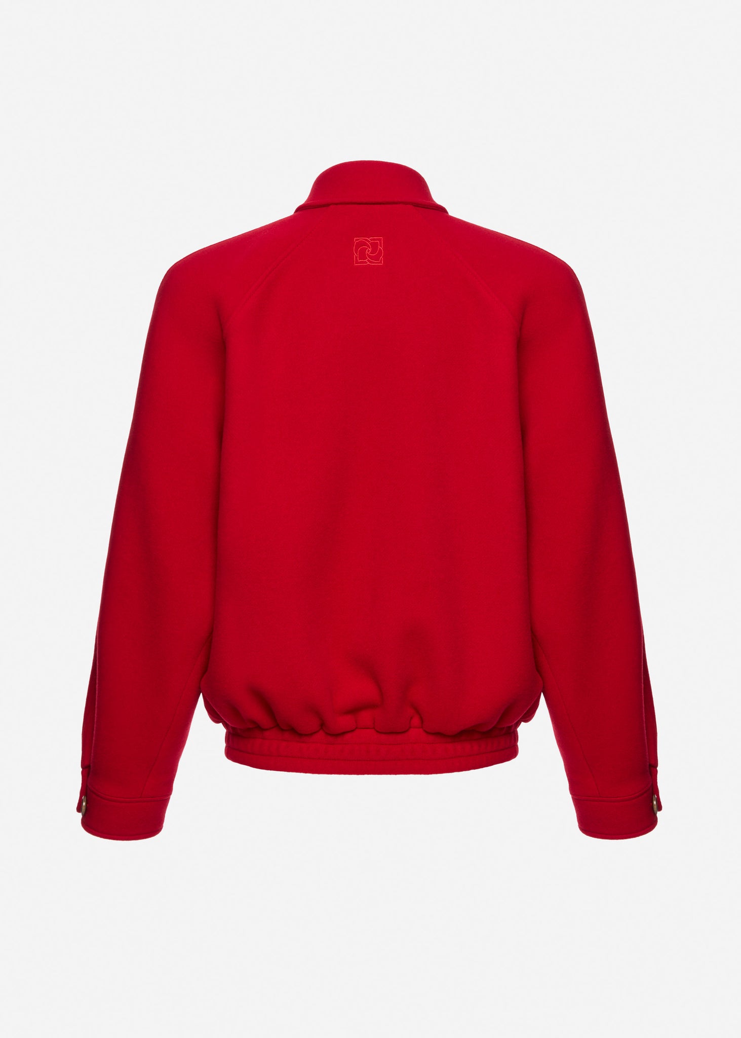 A bomber-style jacket crafted from pure wool. Designed with a stand collar and raglan sleeves finished with buttoned cuffs and adjustable tabs. Features two welt pockets with single flaps secured by buttons and removable shoulder pads for a structured silhouette. The hem is gathered with an elasticated band for a softly rounded shape. Fully lined, with an interior welt pocket on the left side.