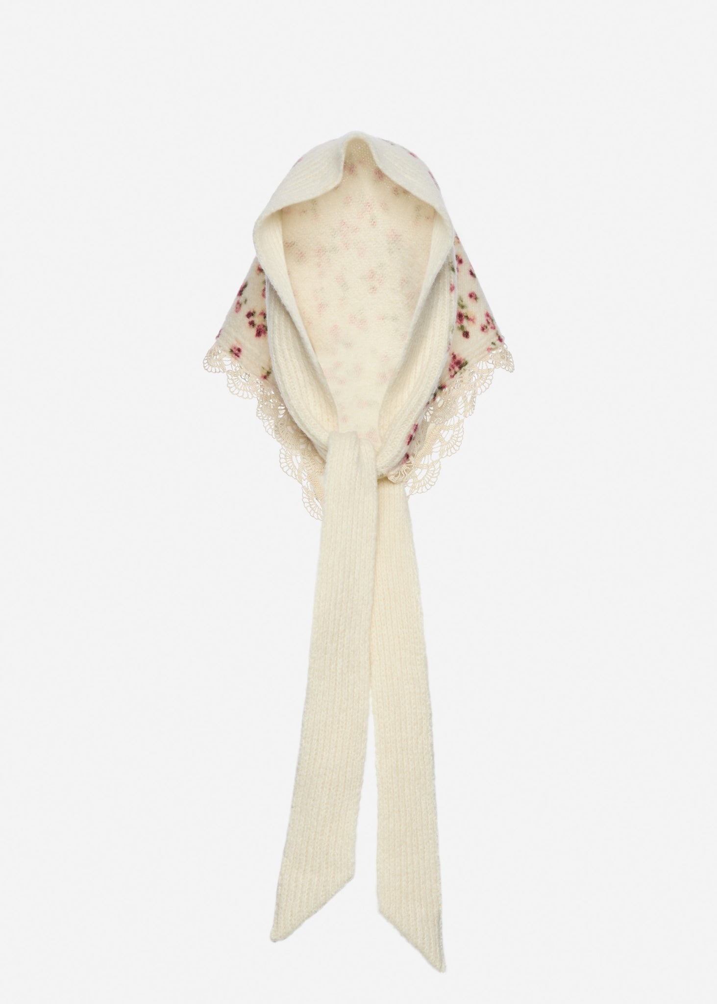 Soft wool, silk and cashmere scarf featuring a delicate pink floral pattern. Designed with extended ties that can be wrapped or knotted under the chin and finished with a scalloped crochet lace edge. A romantic accessory that perfectly complements the matching knit pieces.