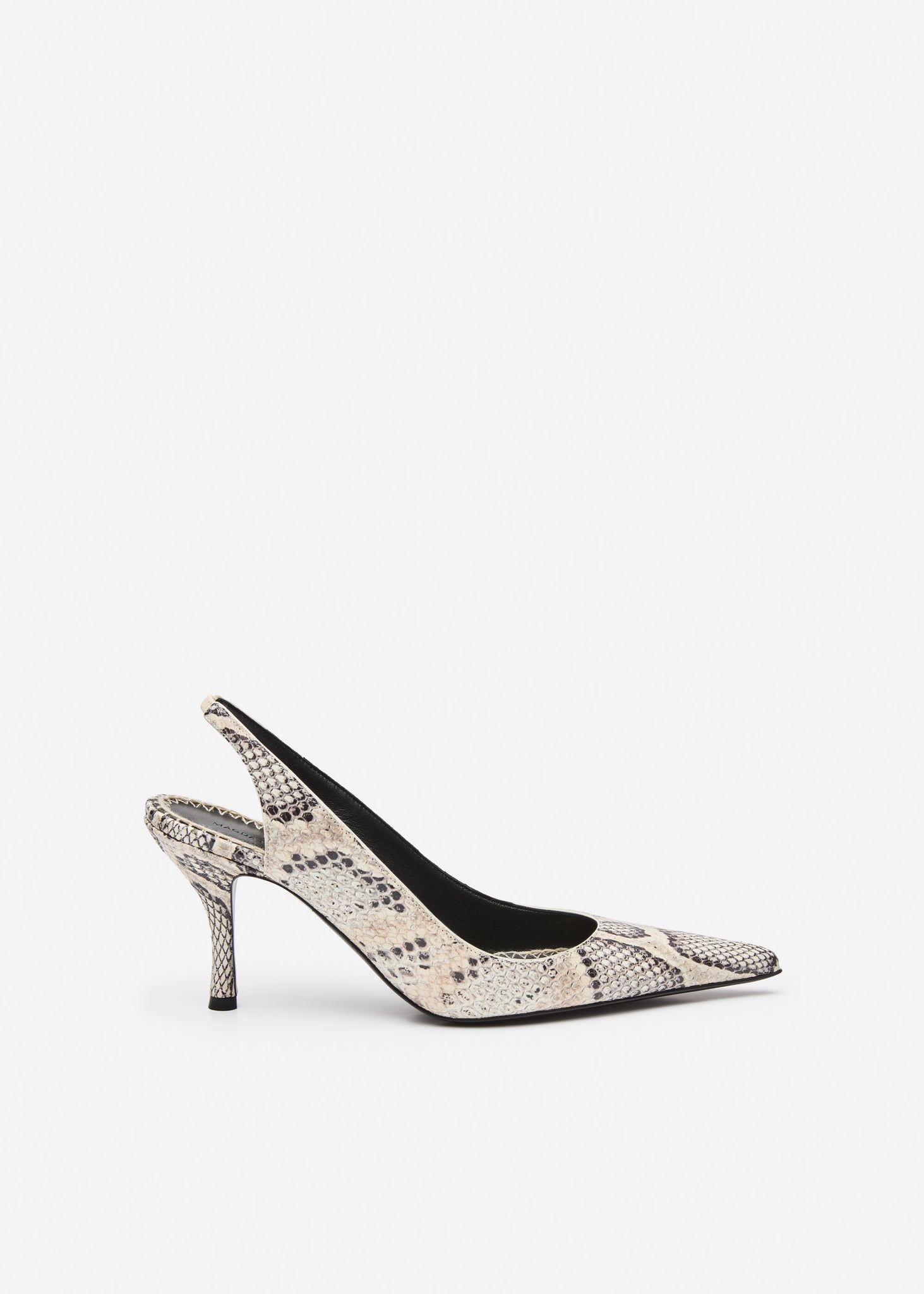 Classic pointed-toe slingback featuring a curved mid-heel for elegant elevation and a minimalist silhouette. Available in plain, studded, and snakeskin-embossed variations. Heel height is 8,5 cm.