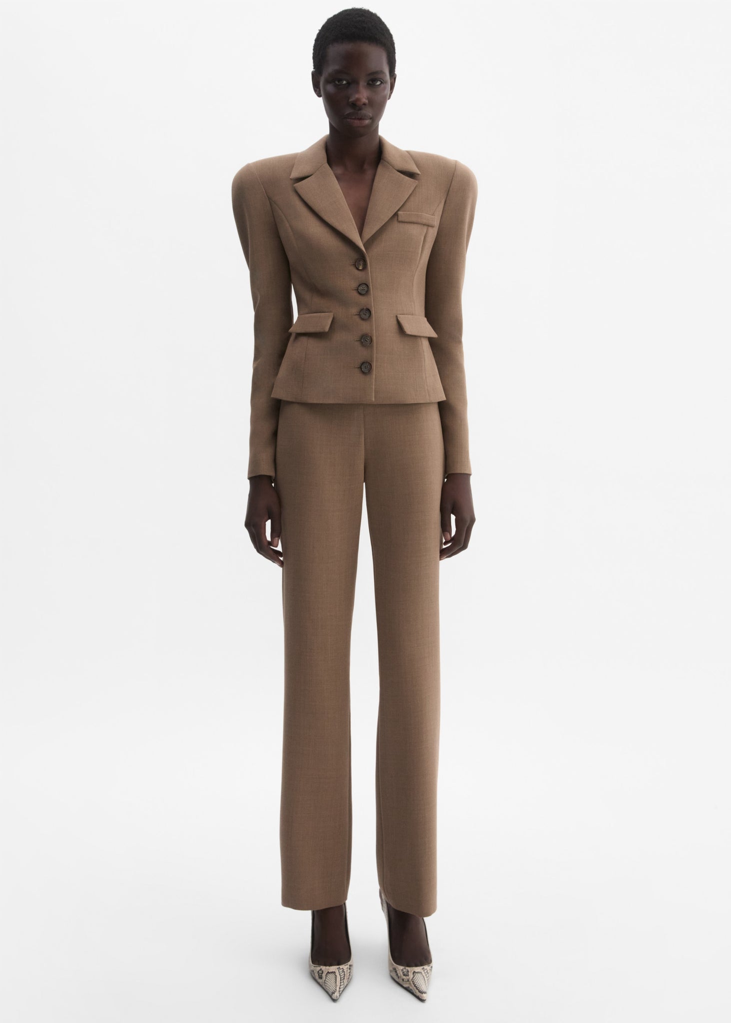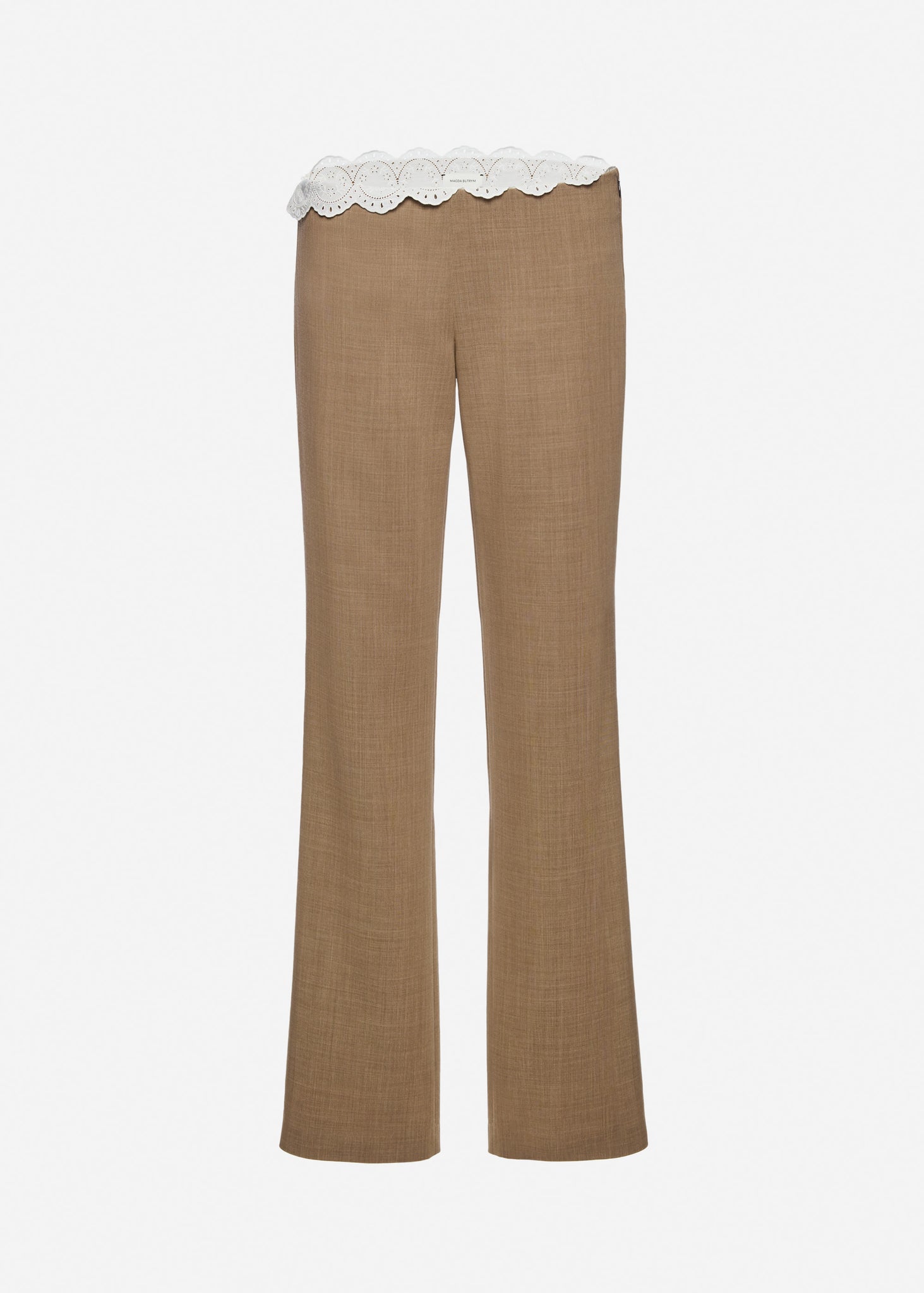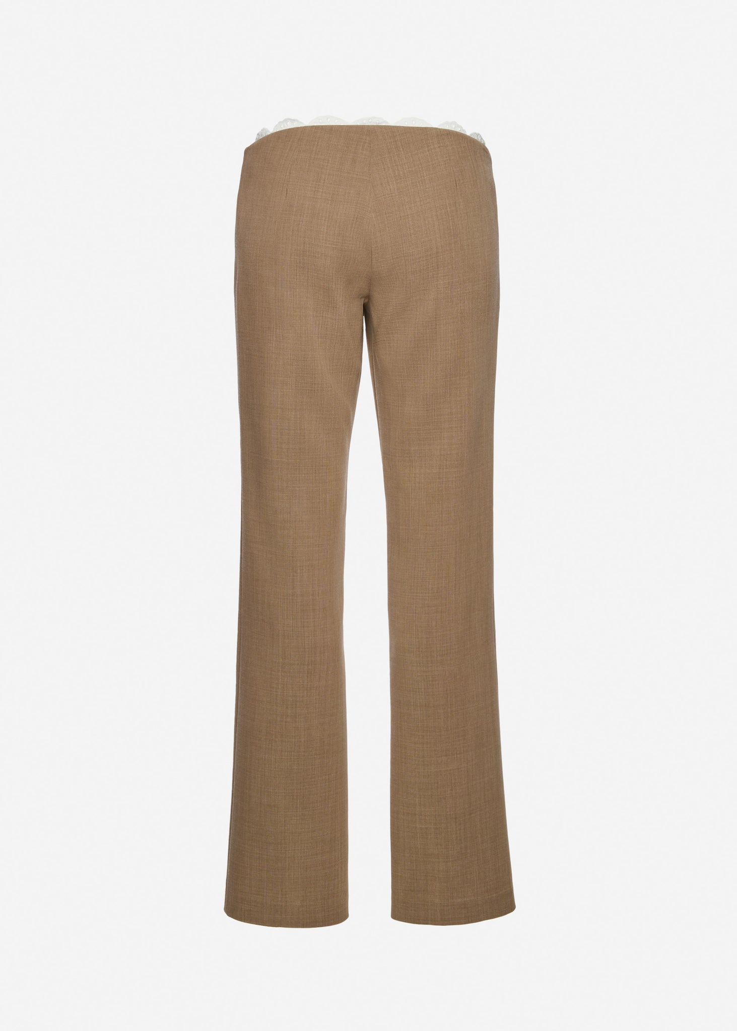Tailored from soft wool with a straight-leg silhouette. The low-rise waistband is finished with a delicate lace trim and an asymmetric folded detail on the right side for an artisanal touch. A concealed side zip and interior button-tab closure ensure a clean fit. Romantic twist to classic suiting.