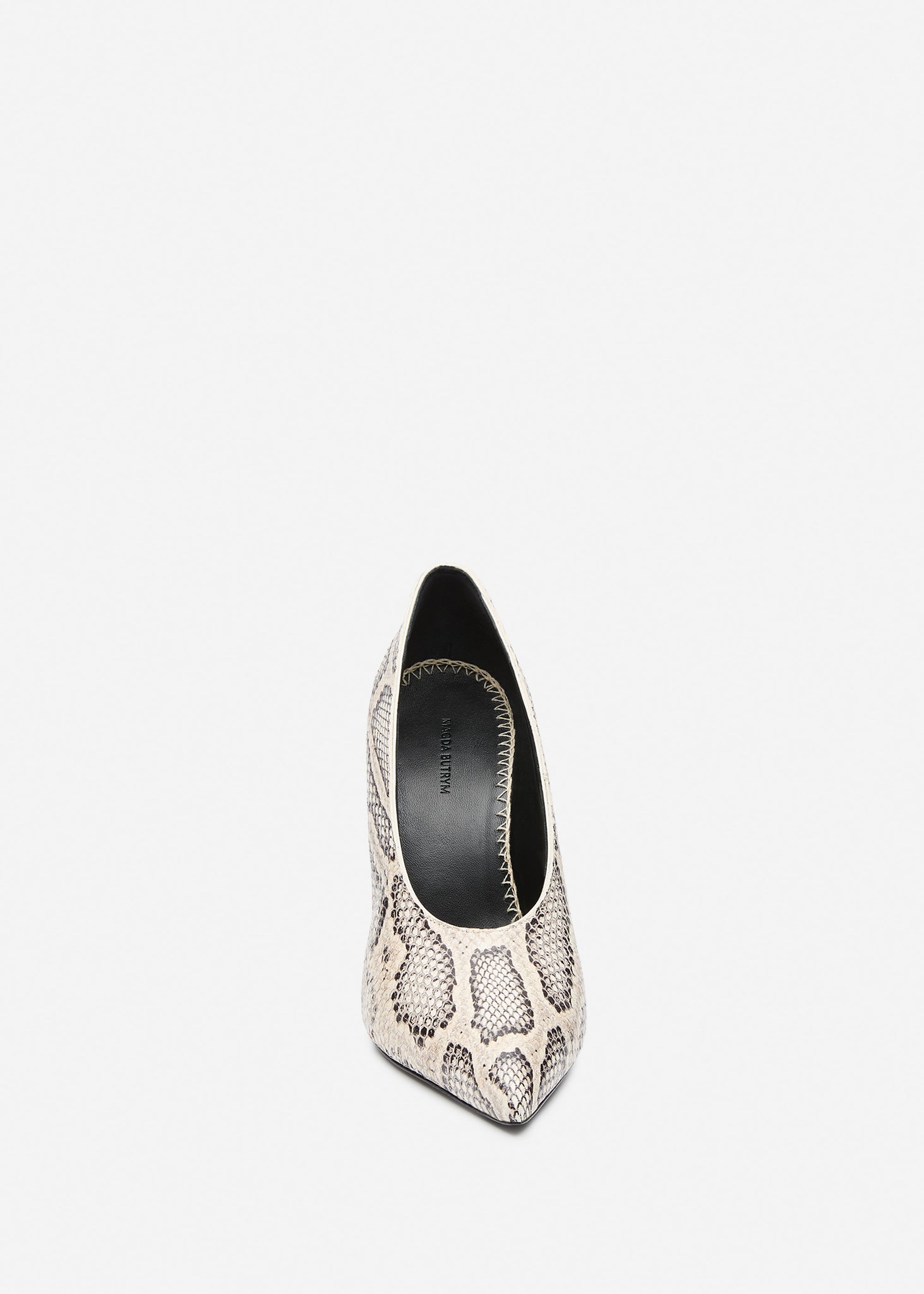 These pumps are crafted with a sharply pointed toe and a uniquely sculpted curved heel. The minimalist upper contrasts with the dramatic architecture of the base, creating a silhouette that is both refined and avant-garde. Heel height is 11,5 cm.
