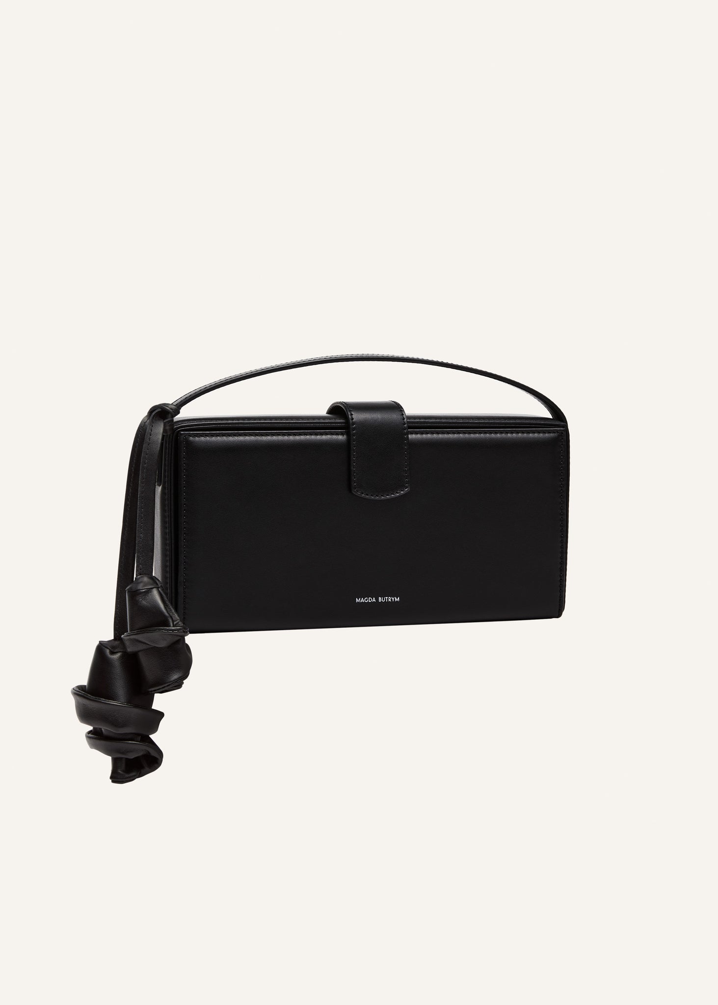 Magda's Apolonia bag is a chic pochette with a box design and simple strap, characterized by its timeless and minimal design. On the inside of the bag is a very special hand painted rose. The bag is made recognizably Magda with its detachable flower charm at handle.
