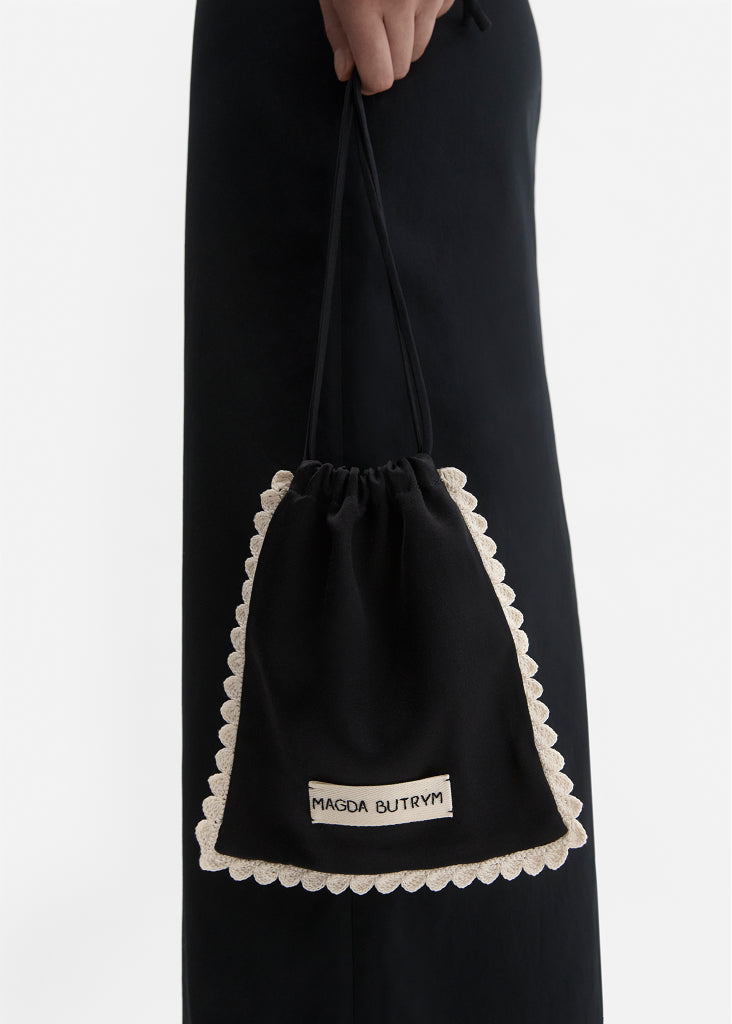 A refined pouch crafted from smooth black silk, elevated with delicate white crochet trim that adds a handmade, artisanal touch. The minimalist silhouette is secured with a slender drawstring closure. Perfect as a chic accessory for carrying small essentials or for adding a unique accent to evening ensembles.