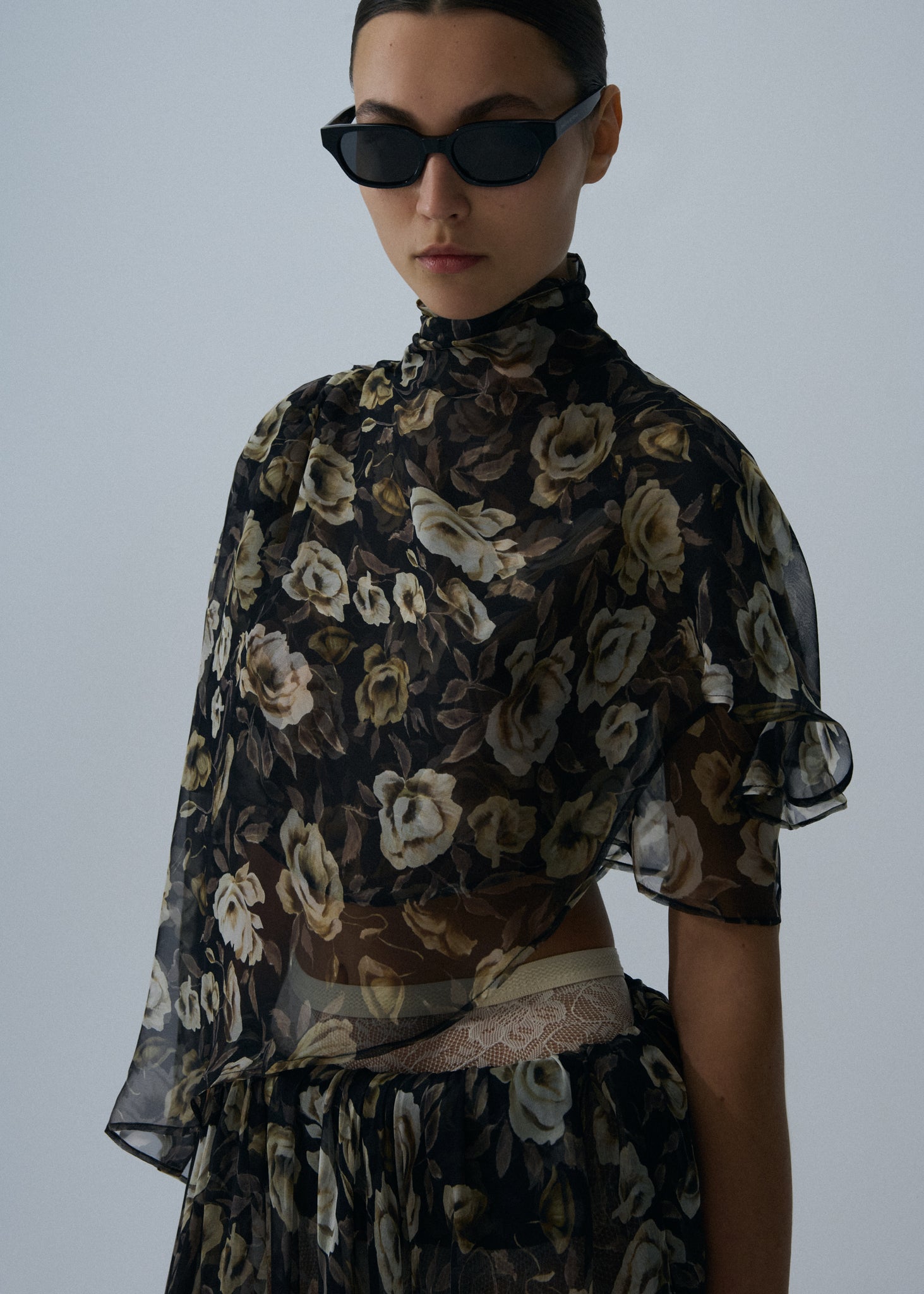 Crafted from layers of sheer silk, this high-neck blouse has an asymmetrical cropped hemline with flowing sleeves and body for a romantic look.