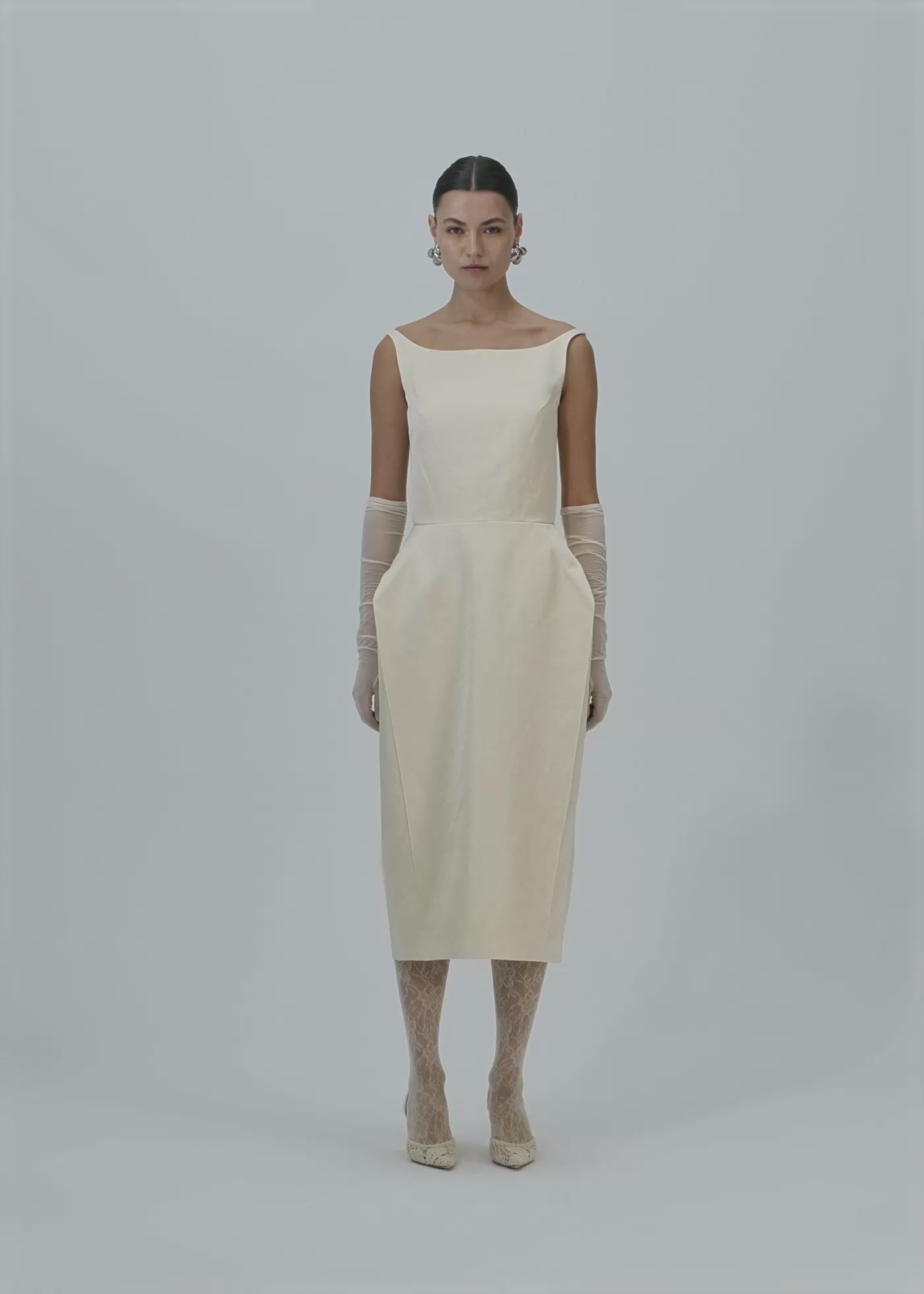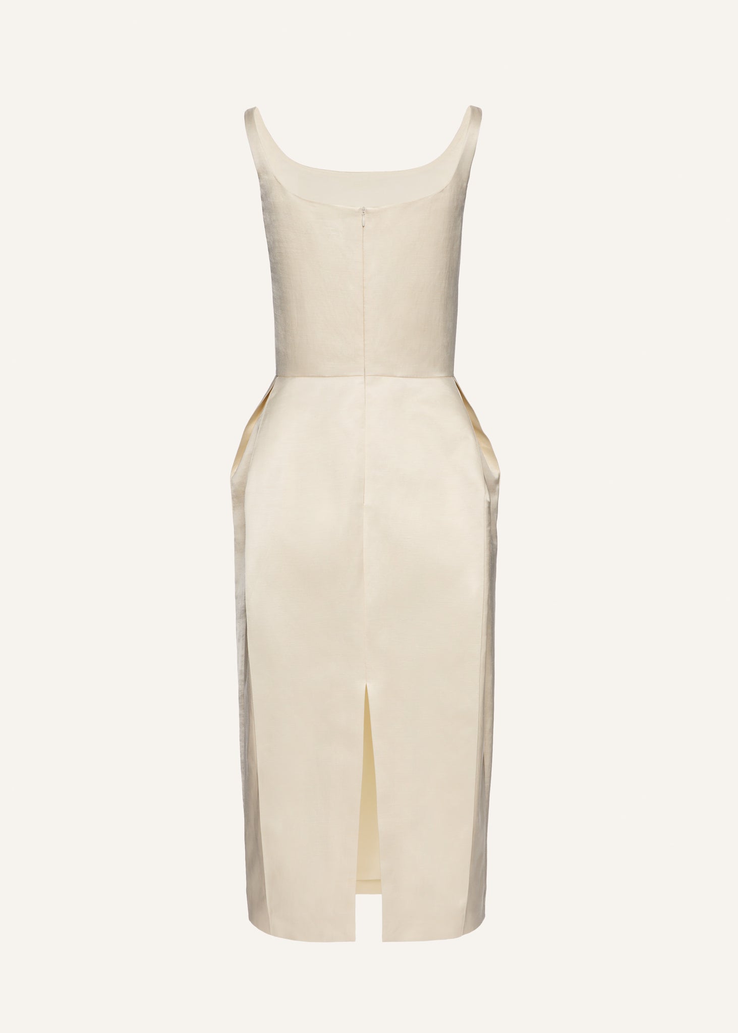 This ladylike midi dress is made from lightweight linen blend fabric and creates an hourglass shape by using hip pads and a fitted bodice, complemented by a rounded off-shoulder neckline.