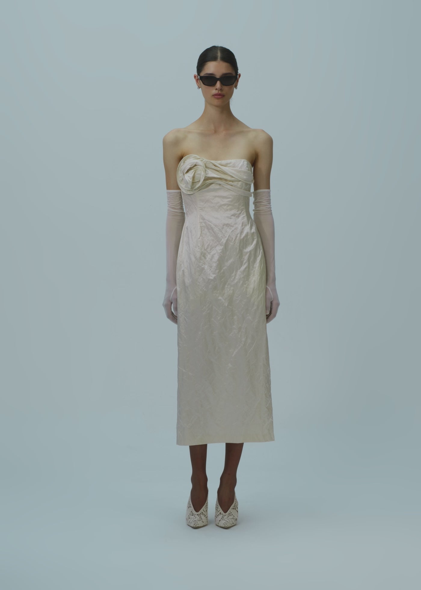 This elegant strapless dress features a beautifully ruched bodice that creates a sculptural, rose-like accent. The fitted silhouette hugs the body, offering a sophisticated and flattering shape